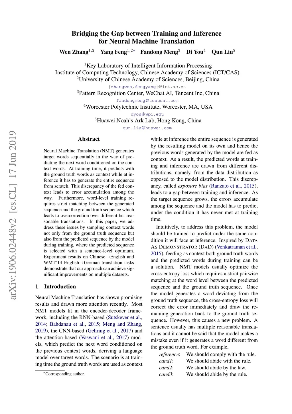 Bridging the Gap between Training and Inference for Neural Machine