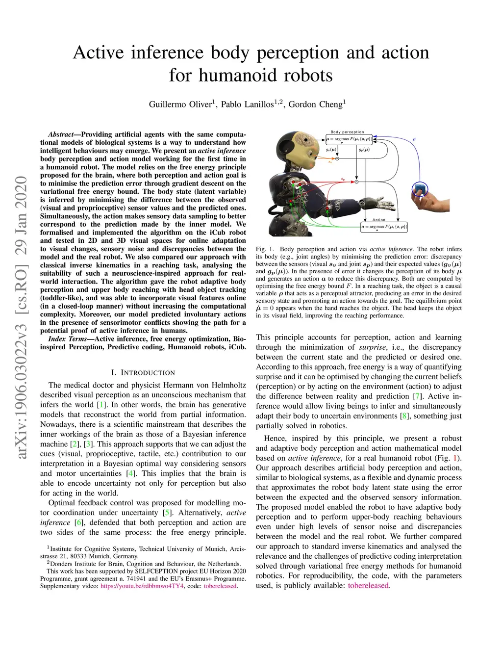 Providing artificial agents with the same computational models of biological systems is a way to understand how intelligent behaviours may emerge. We present an active inference body perception and action model working for the first time in a humanoid robot. The model relies on the free energy principle proposed for the brain, where both perception and action goal is to minimise the prediction error through gradient descent on the variational free energy bound. The body state (latent variable) is inferred by minimising the difference between the observed (visual and proprioceptive) sensor values and the predicted ones. Simultaneously, the action makes sensory data sampling to better correspond to the prediction made by the inner model. We formalised and implemented the algorithm on the iCub robot and tested in 2D and 3D visual spaces for online adaptation to visual changes, sensory noise and discrepancies between the model and the real robot. We also compared our approach with classical inverse kinematics in a reaching task, analysing the suitability of such a neuroscience-inspired approach for real-world interaction. The algorithm gave the robot adaptive body perception and upper body reaching with head object tracking (toddler-like), and was able to incorporate visual features online (in a closed-loop manner) without increasing the computational complexity. Moreover, our model predicted involuntary actions in the presence of sensorimotor conflicts showing the path for a potential proof of active inference in humans.