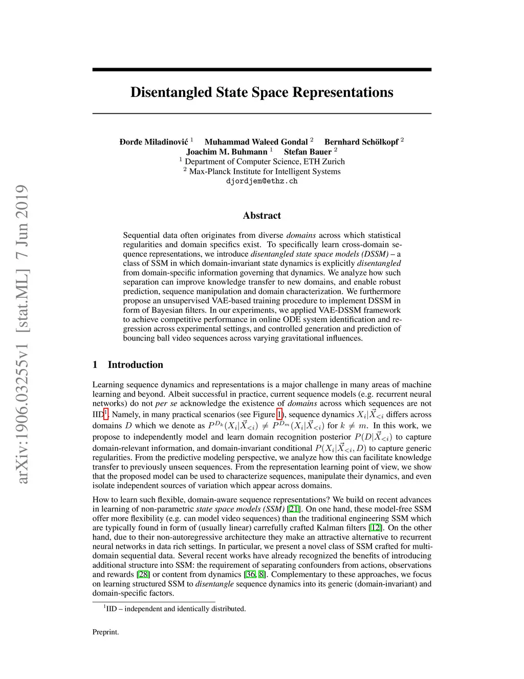 Sequential data often originates from diverse domains across which statistical regularities and domain specifics exist. To specifically learn cross-domain sequence representations, we introduce disentangled state space models (DSSM) -- a class of SSM in which domain-invariant state dynamics is explicitly disentangled from domain-specific information governing that dynamics. We analyze how such separation can improve knowledge transfer to new domains, and enable robust prediction, sequence manipulation and domain characterization. We furthermore propose an unsupervised VAE-based training procedure to implement DSSM in form of Bayesian filters. In our experiments, we applied VAE-DSSM framework to achieve competitive performance in online ODE system identification and regression across experimental settings, and controlled generation and prediction of bouncing ball video sequences across varying gravitational influences.