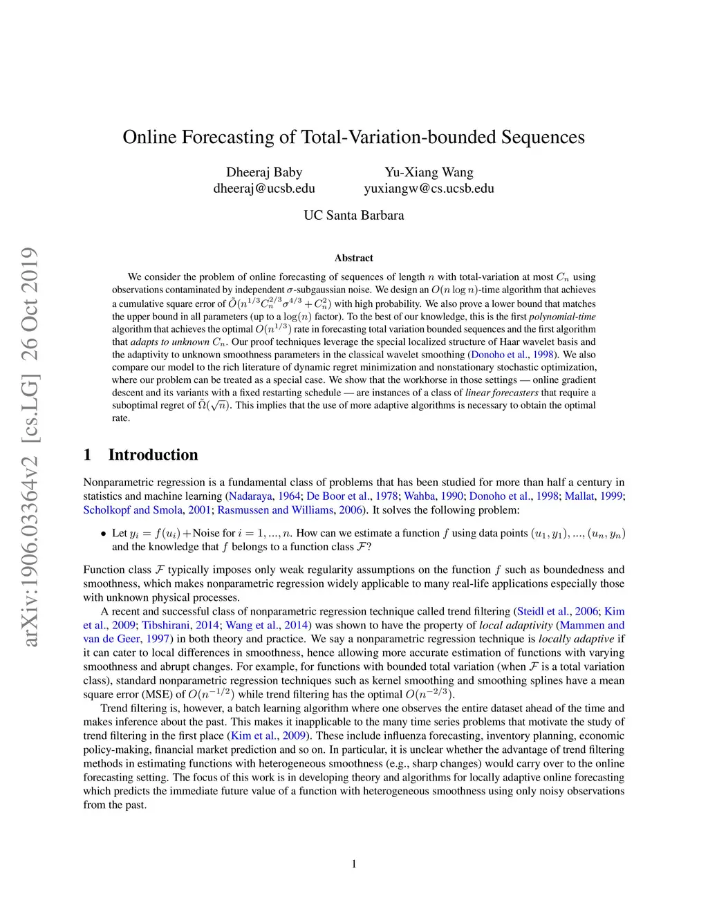 We consider the problem of online forecasting of sequences of length with total-variation at most using observations contaminated by independent -subgaussian noise. We design an -time algorithm that achieves a cumulative square error of with high probability.We also prove a lower bound that matches the upper bound in all parameters (up to a factor). To the best of our knowledge, this is the first \emph{polynomial-time} algorithm that achieves the optimal rate in forecasting total variation bounded sequences and the first algorithm that \emph{adapts to unknown} . Our proof techniques leverage the special localized structure of Haar wavelet basis and the adaptivity to unknown smoothness parameters in the classical wavelet smoothing [Donoho et al., 1998]. We also compare our model to the rich literature of dynamic regret minimization and nonstationary stochastic optimization, where our problem can be treated as a special case. We show that the workhorse in those settings --- online gradient descent and its variants with a fixed restarting schedule --- are instances of a class of \emph{linear forecasters} that require a suboptimal regret of . This implies that the use of more adaptive algorithms is necessary to obtain the optimal rate.