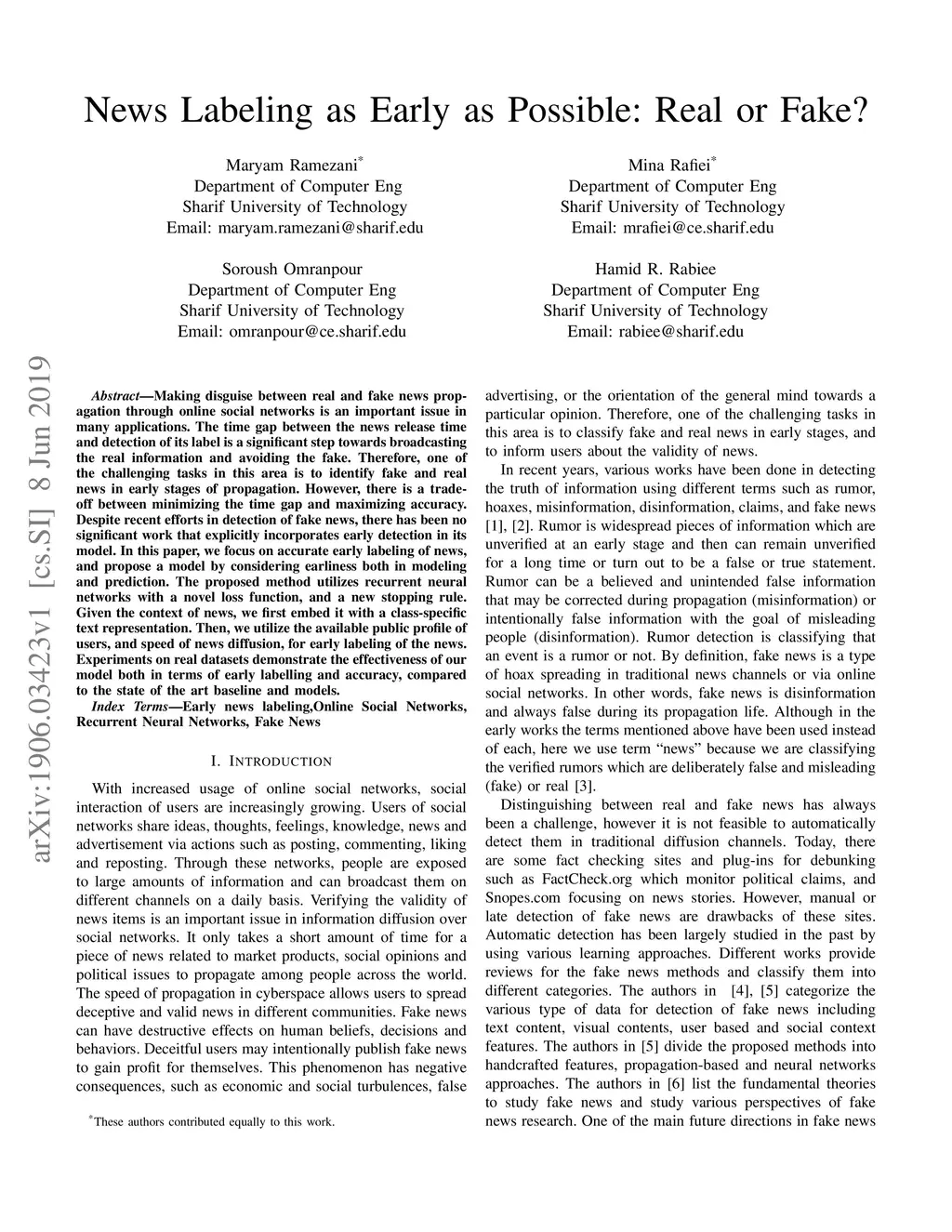 Making disguise between real and fake news propagation through online social networks is an important issue in many applications. The time gap between the news release time and detection of its label is a significant step towards broadcasting the real information and avoiding the fake. Therefore, one of the challenging tasks in this area is to identify fake and real news in early stages of propagation. However, there is a trade-off between minimizing the time gap and maximizing accuracy. Despite recent efforts in detection of fake news, there has been no significant work that explicitly incorporates early detection in its model. In this paper, we focus on accurate early labeling of news, and propose a model by considering earliness both in modeling and prediction. The proposed method utilizes recurrent neural networks with a novel loss function, and a new stopping rule. Given the context of news, we first embed it with a class-specific text representation. Then, we utilize the available public profile of users, and speed of news diffusion, for early labeling of the news. Experiments on real datasets demonstrate the effectiveness of our model both in terms of early labelling and accuracy, compared to the state of the art baseline and models.