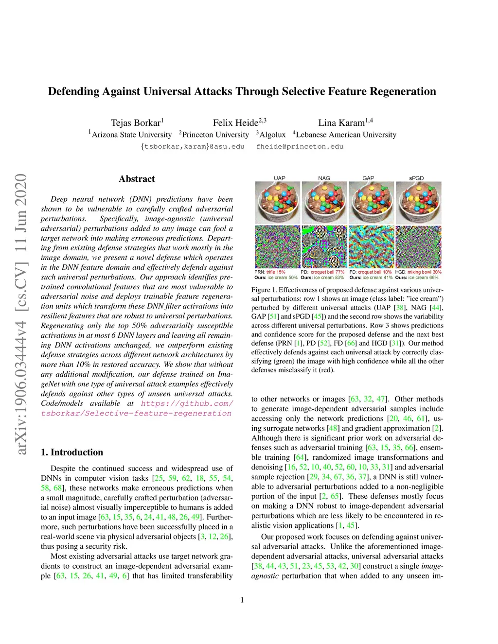 Deep neural network (DNN) predictions have been shown to be vulnerable to carefully crafted adversarial perturbations. Specifically, image-agnostic (universal adversarial) perturbations added to any image can fool a target network into making erroneous predictions. Departing from existing defense strategies that work mostly in the image domain, we present a novel defense which operates in the DNN feature domain and effectively defends against such universal perturbations. Our approach identifies pre-trained convolutional features that are most vulnerable to adversarial noise and deploys trainable feature regeneration units which transform these DNN filter activations into resilient features that are robust to universal perturbations. Regenerating only the top 50% adversarially susceptible activations in at most 6 DNN layers and leaving all remaining DNN activations unchanged, we outperform existing defense strategies across different network architectures by more than 10% in restored accuracy. We show that without any additional modification, our defense trained on ImageNet with one type of universal attack examples effectively defends against other types of unseen universal attacks.
