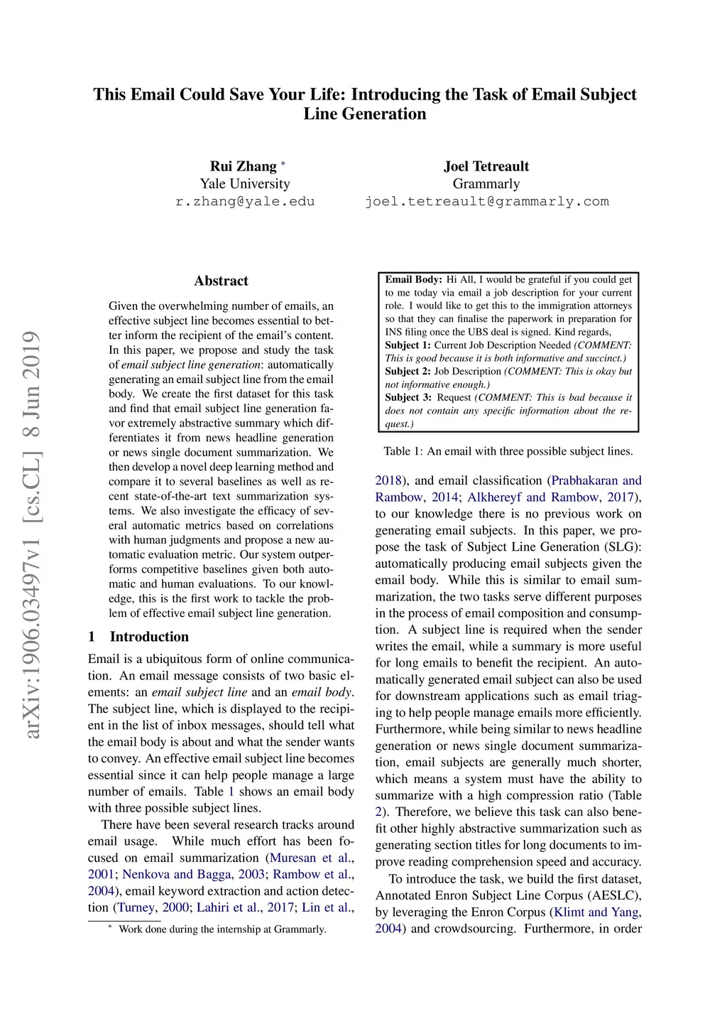 This Email Could Save Your Life: Introducing the Task of Email Subject