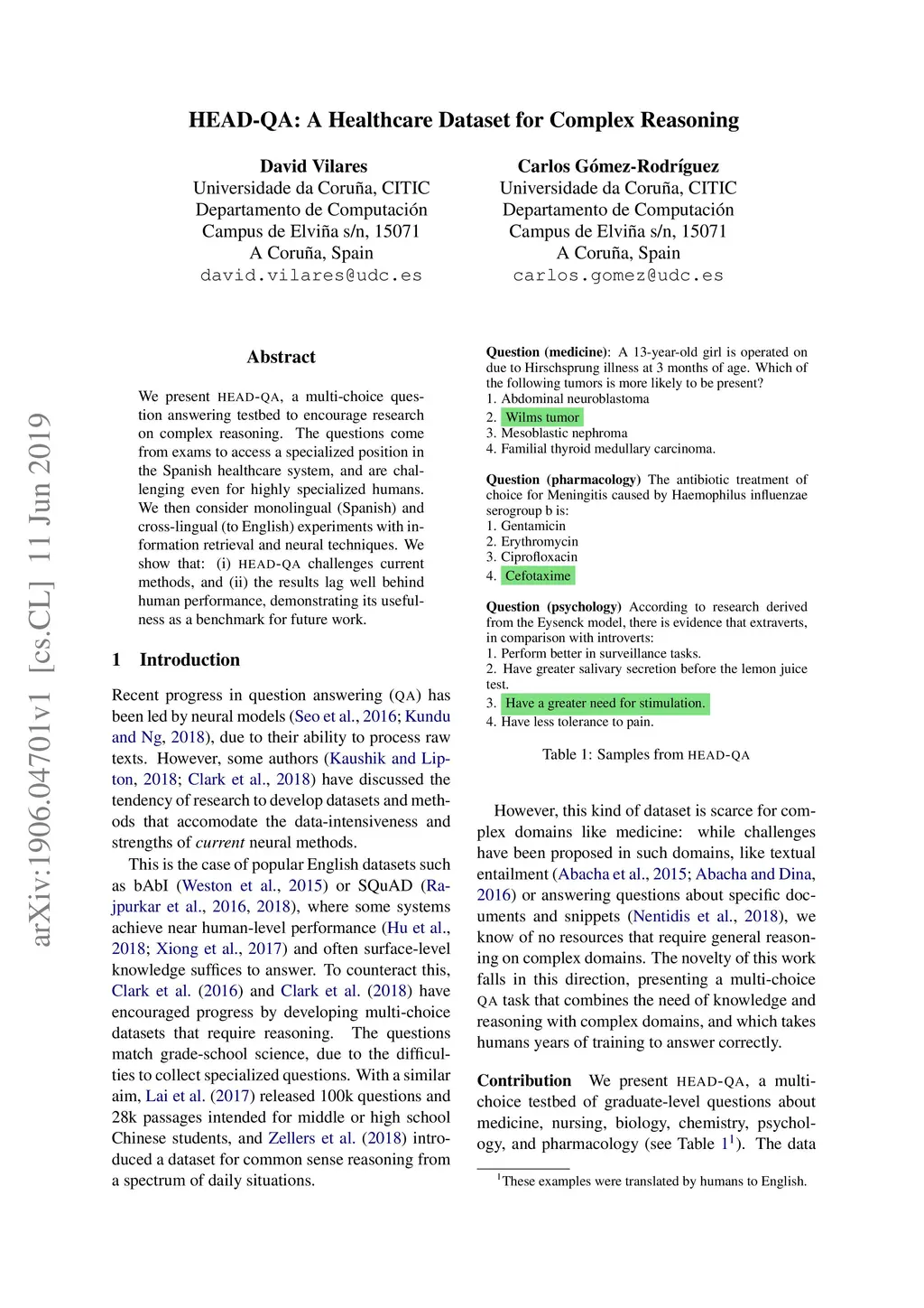 HEAD-QA: A Healthcare Dataset for Complex Reasoning