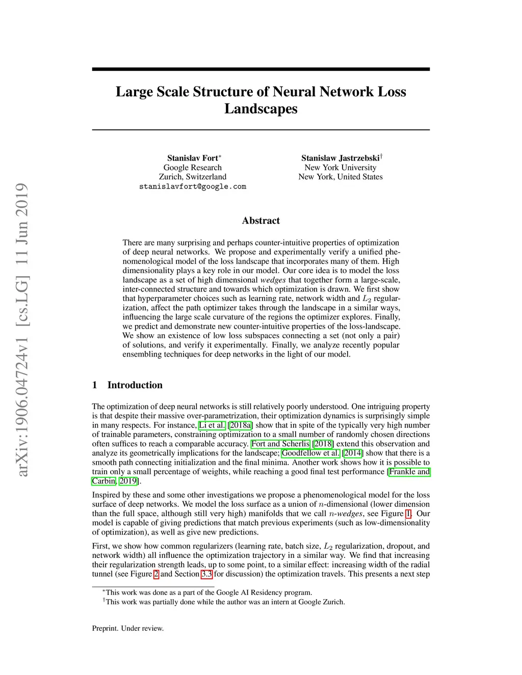 There are many surprising and perhaps counter-intuitive properties of optimization of deep neural networks. We propose and experimentally verify a unified phenomenological model of the loss landscape that incorporates many of them. High dimensionality plays a key role in our model. Our core idea is to model the loss landscape as a set of high dimensional \emph{wedges} that together form a large-scale, inter-connected structure and towards which optimization is drawn. We first show that hyperparameter choices such as learning rate, network width and regularization, affect the path optimizer takes through the landscape in a similar ways, influencing the large scale curvature of the regions the optimizer explores. Finally, we predict and demonstrate new counter-intuitive properties of the loss-landscape. We show an existence of low loss subspaces connecting a set (not only a pair) of solutions, and verify it experimentally. Finally, we analyze recently popular ensembling techniques for deep networks in the light of our model.