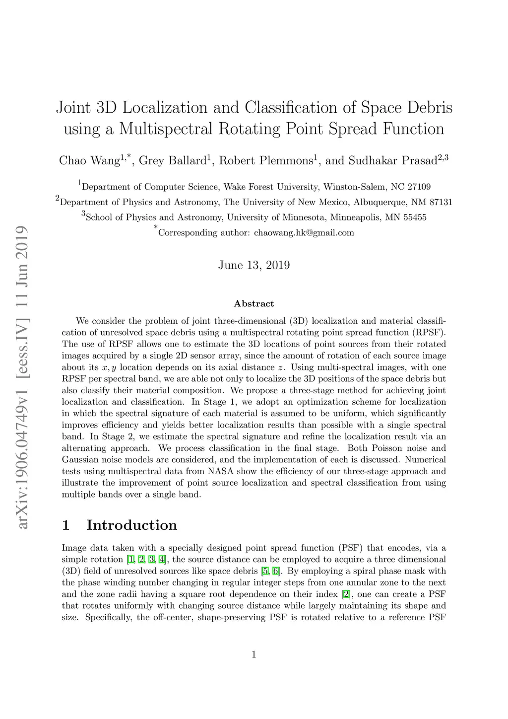 We consider the problem of joint three-dimensional (3D) localization and material classification of unresolved space debris using a multispectral rotating point spread function (RPSF). The use of RPSF allows one to estimate the 3D locations of point sources from their rotated images acquired by a single 2D sensor array, since the amount of rotation of each source image about its x, y location depends on its axial distance z. Using multi-spectral images, with one RPSF per spectral band, we are able not only to localize the 3D positions of the space debris but also classify their material composition. We propose a three-stage method for achieving joint localization and classification. In Stage 1, we adopt an optimization scheme for localization in which the spectral signature of each material is assumed to be uniform, which significantly improves efficiency and yields better localization results than possible with a single spectral band. In Stage 2, we estimate the spectral signature and refine the localization result via an alternating approach. We process classification in the final stage. Both Poisson noise and Gaussian noise models are considered, and the implementation of each is discussed. Numerical tests using multispectral data from NASA show the efficiency of our three-stage approach and illustrate the improvement of point source localization and spectral classification from using multiple bands over a single band.