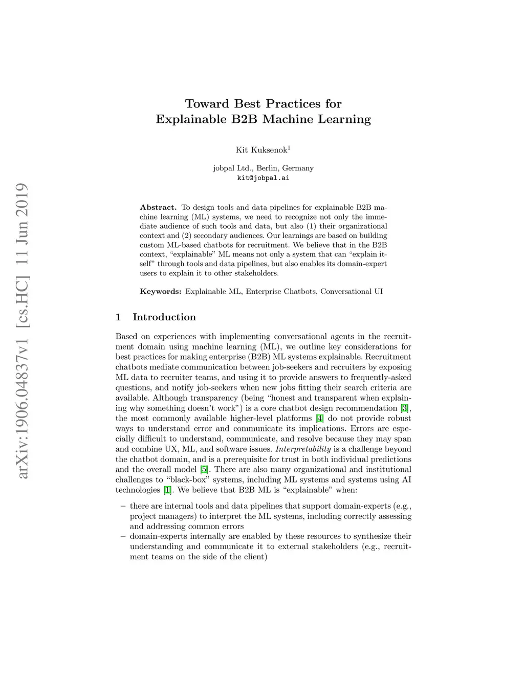 To design tools and data pipelines for explainable B2B machine learning (ML) systems, we need to recognize not only the immediate audience of such tools and data, but also (1) their organizational context and (2) secondary audiences. Our learnings are based on building custom ML-based chatbots for recruitment. We believe that in the B2B context, "explainable" ML means not only a system that can "explain itself" through tools and data pipelines, but also enables its domain-expert users to explain it to other stakeholders.
