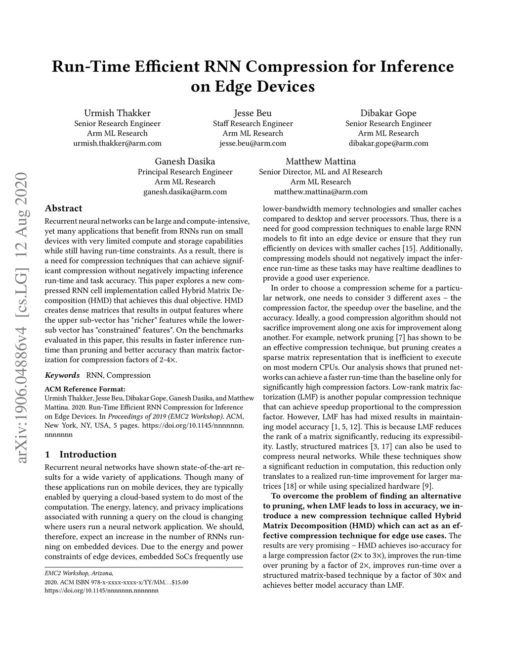 Recurrent neural networks can be large and compute-intensive, yet many applications that benefit from RNNs run on small devices with very limited compute and storage capabilities while still having run-time constraints. As a result, there is a need for compression techniques that can achieve significant compression without negatively impacting inference run-time and task accuracy. This paper explores a new compressed RNN cell implementation called Hybrid Matrix Decomposition (HMD) that achieves this dual objective. This scheme divides the weight matrix into two parts - an unconstrained upper half and a lower half composed of rank-1 blocks. This results in output features where the upper sub-vector has "richer" features while the lower-sub vector has "constrained features". HMD can compress RNNs by a factor of 2-4x while having a faster run-time than pruning (Zhu &Gupta, 2017) and retaining more model accuracy than matrix factorization (Grachev et al., 2017). We evaluate this technique on 5 benchmarks spanning 3 different applications, illustrating its generality in the domain of edge computing.