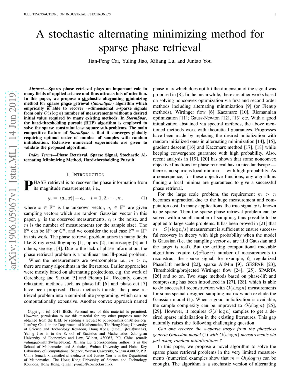 Sparse phase retrieval plays an important role in many fields of applied science and thus attracts lots of attention. In this paper, we propose a \underline{sto}chastic alte\underline{r}nating \underline{m}inimizing method for \underline{sp}arse ph\underline{a}se \underline{r}etrieval (\textit{StormSpar}) algorithm which {emprically} is able to recover -dimensional -sparse signals from only number of measurements without a desired initial value required by many existing methods. In \textit{StormSpar}, the hard-thresholding pursuit (HTP) algorithm is employed to solve the sparse constraint least square sub-problems. The main competitive feature of \textit{StormSpar} is that it converges globally requiring optimal order of number of samples with random initialization. Extensive numerical experiments are given to validate the proposed algorithm.