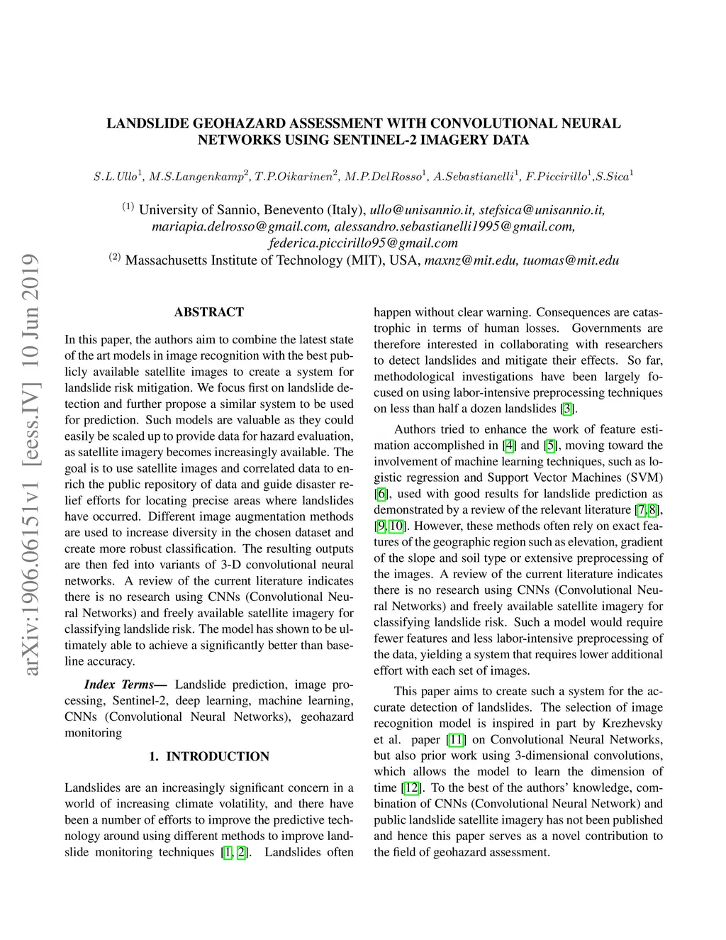 In this paper, the authors aim to combine the latest state of the art models in image recognition with the best publicly available satellite images to create a system for landslide risk mitigation. We focus first on landslide detection and further propose a similar system to be used for prediction. Such models are valuable as they could easily be scaled up to provide data for hazard evaluation, as satellite imagery becomes increasingly available. The goal is to use satellite images and correlated data to enrich the public repository of data and guide disaster relief efforts for locating precise areas where landslides have occurred. Different image augmentation methods are used to increase diversity in the chosen dataset and create more robust classification. The resulting outputs are then fed into variants of 3-D convolutional neural networks. A review of the current literature indicates there is no research using CNNs (Convolutional Neural Networks) and freely available satellite imagery for classifying landslide risk. The model has shown to be ultimately able to achieve a significantly better than baseline accuracy.