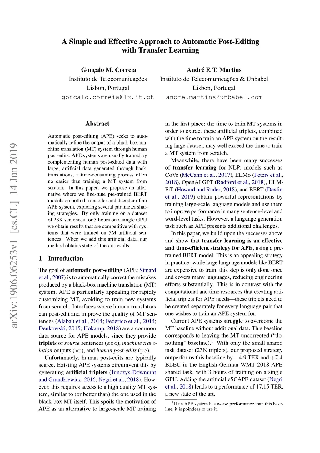 A Simple and Effective Approach to Automatic Post-Editing with Transfer