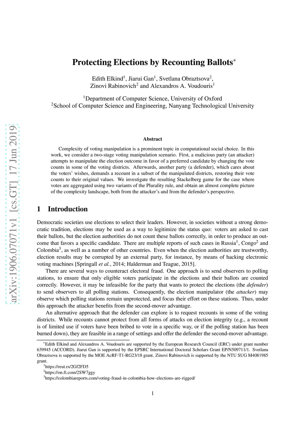 Complexity of voting manipulation is a prominent topic in computational social choice. In this work, we consider a two-stage voting manipulation scenario. First, a malicious party (an attacker) attempts to manipulate the election outcome in favor of a preferred candidate by changing the vote counts in some of the voting districts. Afterwards, another party (a defender), which cares about the voters' wishes, demands a recount in a subset of the manipulated districts, restoring their vote counts to their original values. We investigate the resulting Stackelberg game for the case where votes are aggregated using two variants of the Plurality rule, and obtain an almost complete picture of the complexity landscape, both from the attacker's and from the defender's perspective.