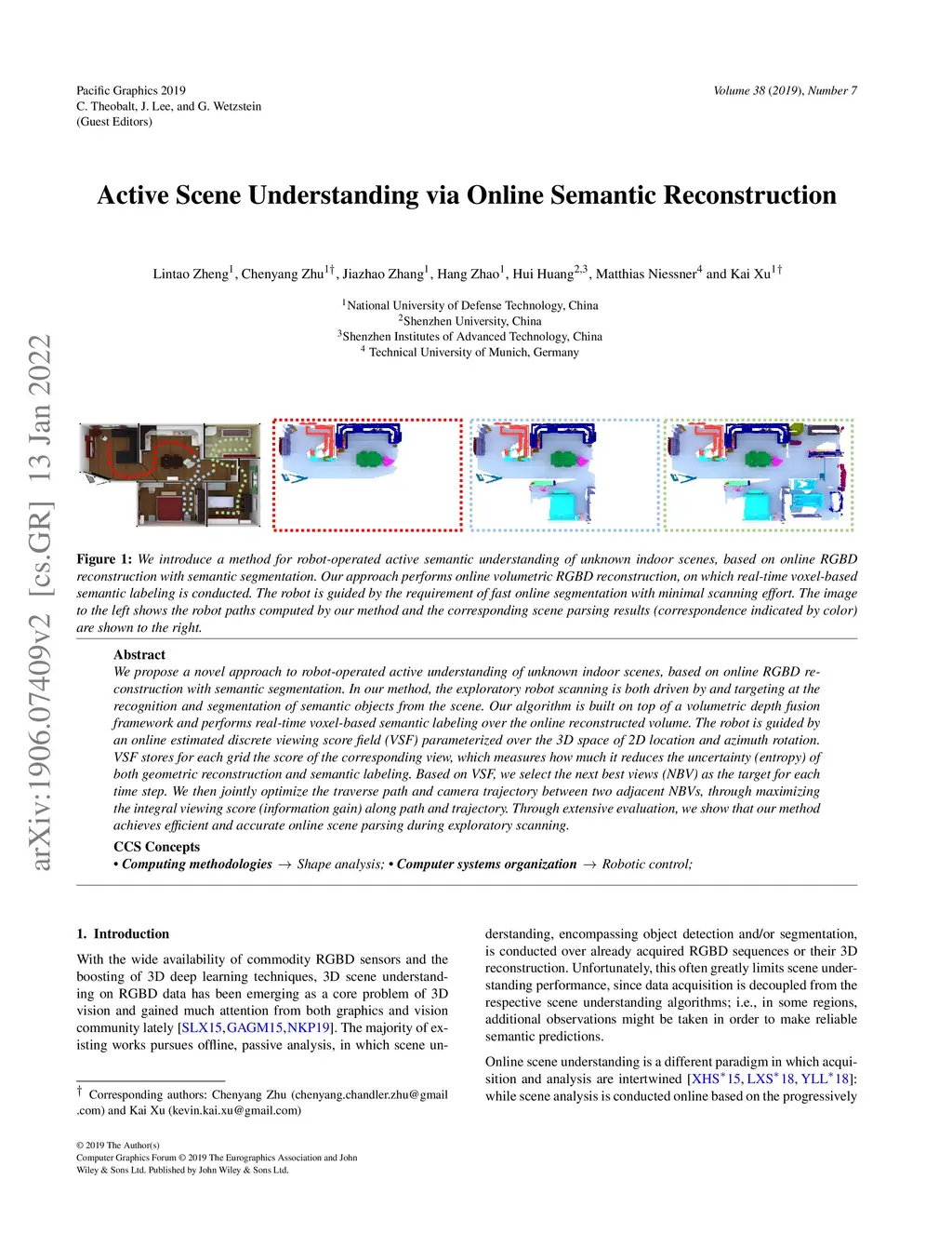 We propose a novel approach to robot-operated active understanding of unknown indoor scenes, based on online RGBD reconstruction with semantic segmentation. In our method, the exploratory robot scanning is both driven by and targeting at the recognition and segmentation of semantic objects from the scene. Our algorithm is built on top of the volumetric depth fusion framework (e.g., KinectFusion) and performs real-time voxel-based semantic labeling over the online reconstructed volume. The robot is guided by an online estimated discrete viewing score field (VSF) parameterized over the 3D space of 2D location and azimuth rotation. VSF stores for each grid the score of the corresponding view, which measures how much it reduces the uncertainty (entropy) of both geometric reconstruction and semantic labeling. Based on VSF, we select the next best views (NBV) as the target for each time step. We then jointly optimize the traverse path and camera trajectory between two adjacent NBVs, through maximizing the integral viewing score (information gain) along path and trajectory. Through extensive evaluation, we show that our method achieves efficient and accurate online scene parsing during exploratory scanning.