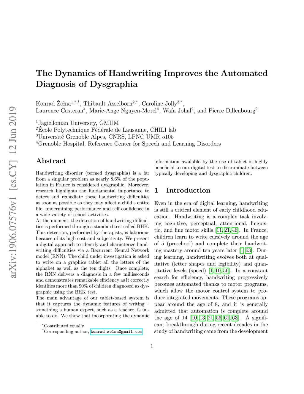 Handwriting disorder (termed dysgraphia) is a far from a singular problem as nearly 8.6% of the population in France is considered dysgraphic. Moreover, research highlights the fundamental importance to detect and remediate these handwriting difficulties as soon as possible as they may affect a child's entire life, undermining performance and self-confidence in a wide variety of school activities. At the moment, the detection of handwriting difficulties is performed through a standard test called BHK. This detection, performed by therapists, is laborious because of its high cost and subjectivity. We present a digital approach to identify and characterize handwriting difficulties via a Recurrent Neural Network model (RNN). The child under investigation is asked to write on a graphics tablet all the letters of the alphabet as well as the ten digits. Once complete, the RNN delivers a diagnosis in a few milliseconds and demonstrates remarkable efficiency as it correctly identifies more than 90% of children diagnosed as dysgraphic using the BHK test. The main advantage of our tablet-based system is that it captures the dynamic features of writing -- something a human expert, such as a teacher, is unable to do. We show that incorporating the dynamic information available by the use of tablet is highly beneficial to our digital test to discriminate between typically-developing and dysgraphic children.
