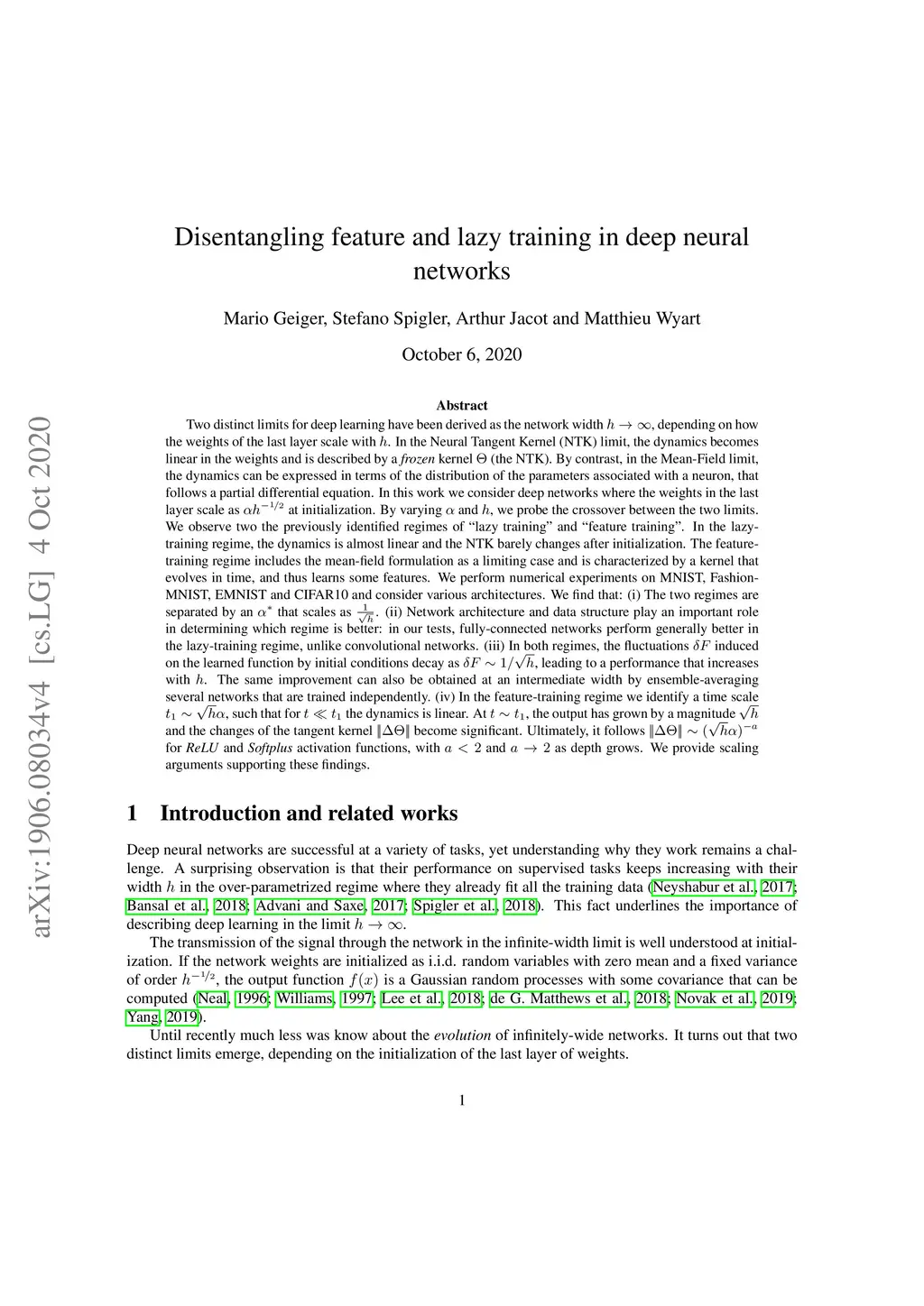 Two distinct limits for deep learning have been derived as the network width , depending on how the weights of the last layer scale with . In the Neural Tangent Kernel (NTK) limit, the dynamics becomes linear in the weights and is described by a frozen kernel . By contrast, in the Mean-Field limit, the dynamics can be expressed in terms of the distribution of the parameters associated with a neuron, that follows a partial differential equation. In this work we consider deep networks where the weights in the last layer scale as at initialization. By varying and , we probe the crossover between the two limits. We observe the previously identified regimes of lazy training and feature training. In the lazy-training regime, the dynamics is almost linear and the NTK barely changes after initialization. The feature-training regime includes the mean-field formulation as a limiting case and is characterized by a kernel that evolves in time, and learns some features. We perform numerical experiments on MNIST, Fashion-MNIST, EMNIST and CIFAR10 and consider various architectures. We find that (i) The two regimes are separated by an that scales as . (ii) Network architecture and data structure play an important role in determining which regime is better: in our tests, fully-connected networks perform generally better in the lazy-training regime, unlike convolutional networks. (iii) In both regimes, the fluctuations induced on the learned function by initial conditions decay as , leading to a performance that increases with . The same improvement can also be obtained at an intermediate width by ensemble-averaging several networks. (iv) In the feature-training regime we identify a time scale , such that for the dynamics is linear.