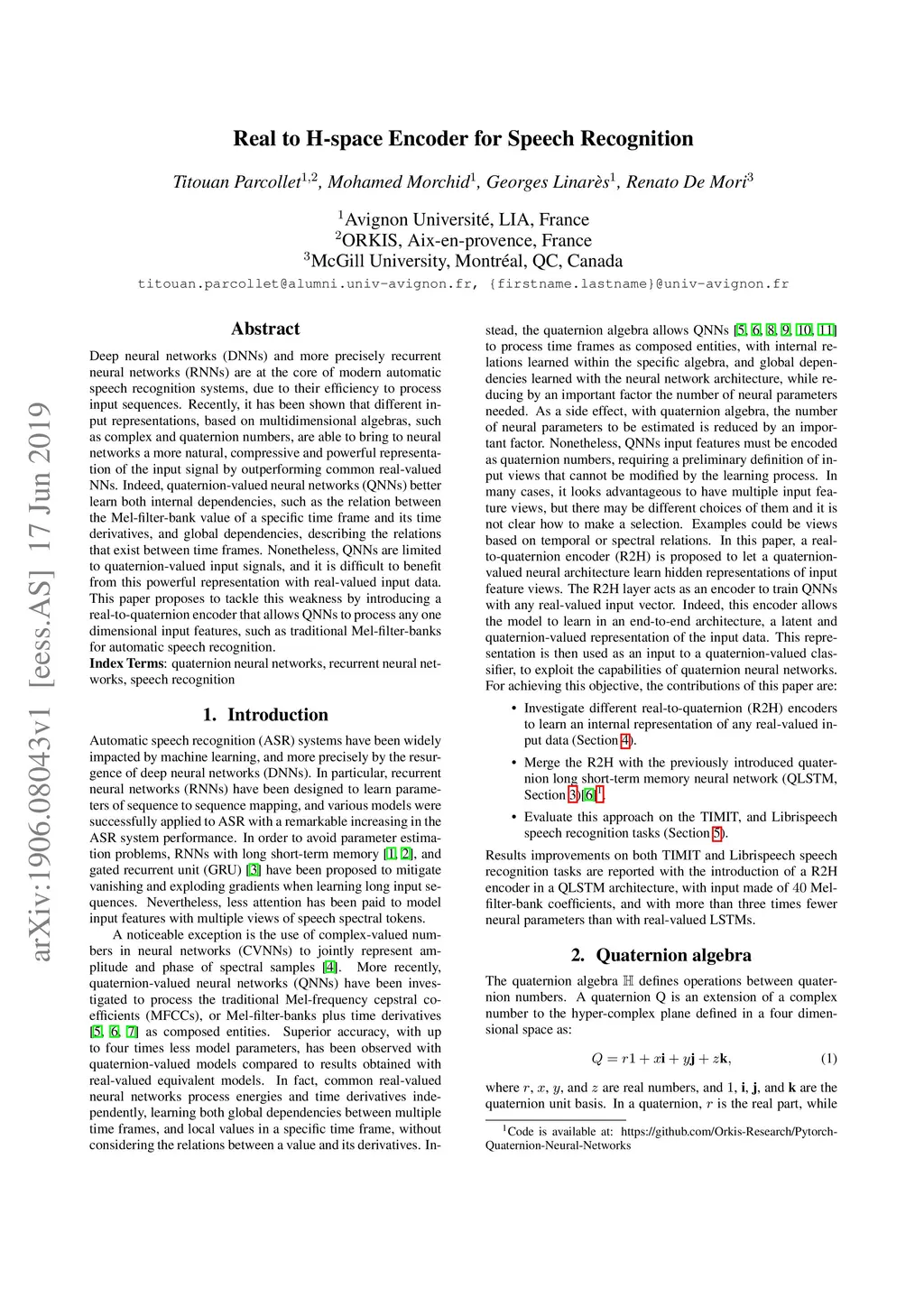 Deep neural networks (DNNs) and more precisely recurrent neural networks (RNNs) are at the core of modern automatic speech recognition systems, due to their efficiency to process input sequences. Recently, it has been shown that different input representations, based on multidimensional algebras, such as complex and quaternion numbers, are able to bring to neural networks a more natural, compressive and powerful representation of the input signal by outperforming common real-valued NNs. Indeed, quaternion-valued neural networks (QNNs) better learn both internal dependencies, such as the relation between the Mel-filter-bank value of a specific time frame and its time derivatives, and global dependencies, describing the relations that exist between time frames. Nonetheless, QNNs are limited to quaternion-valued input signals, and it is difficult to benefit from this powerful representation with real-valued input data. This paper proposes to tackle this weakness by introducing a real-to-quaternion encoder that allows QNNs to process any one dimensional input features, such as traditional Mel-filter-banks for automatic speech recognition.