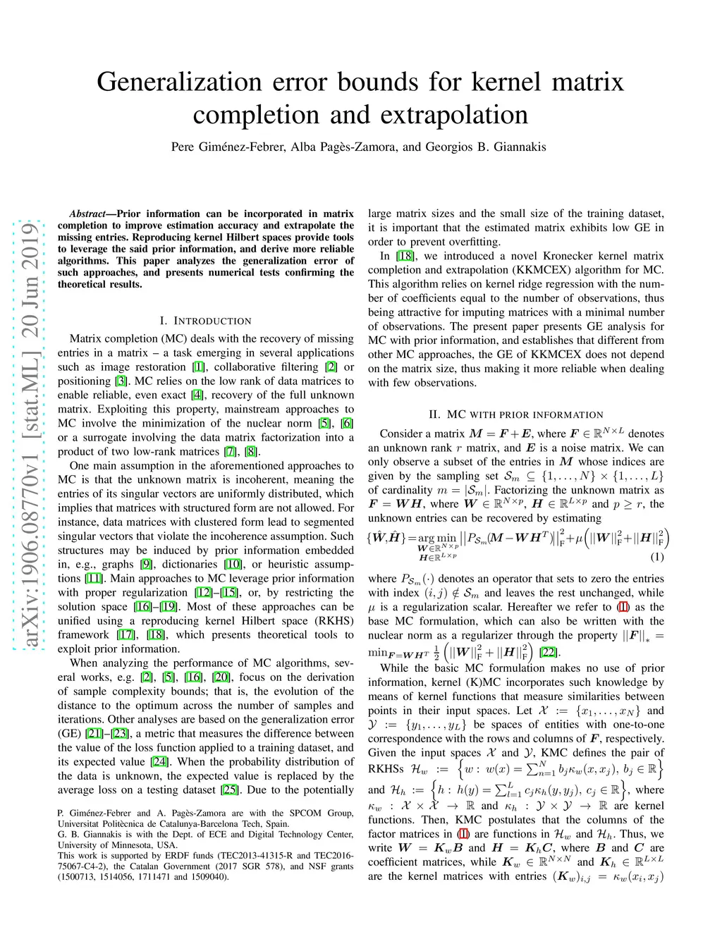 Prior information can be incorporated in matrix completion to improve estimation accuracy and extrapolate the missing entries. Reproducing kernel Hilbert spaces provide tools to leverage the said prior information, and derive more reliable algorithms. This paper analyzes the generalization error of such approaches, and presents numerical tests confirming the theoretical results.