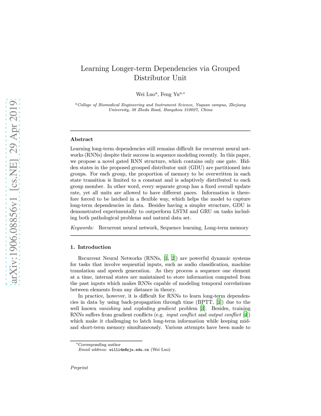 Learning long-term dependencies still remains difficult for recurrent neural networks (RNNs) despite their success in sequence modeling recently. In this paper, we propose a novel gated RNN structure, which contains only one gate. Hidden states in the proposed grouped distributor unit (GDU) are partitioned into groups. For each group, the proportion of memory to be overwritten in each state transition is limited to a constant and is adaptively distributed to each group member. In other word, every separate group has a fixed overall update rate, yet all units are allowed to have different paces. Information is therefore forced to be latched in a flexible way, which helps the model to capture long-term dependencies in data. Besides having a simpler structure, GDU is demonstrated experimentally to outperform LSTM and GRU on tasks including both pathological problems and natural data set.