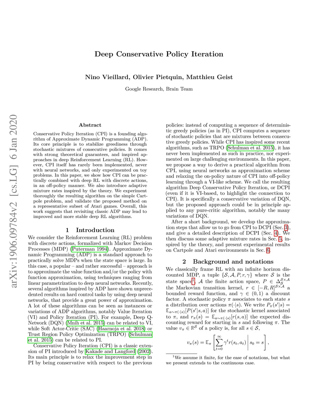 Conservative Policy Iteration (CPI) is a founding algorithm of Approximate Dynamic Programming (ADP). Its core principle is to stabilize greediness through stochastic mixtures of consecutive policies. It comes with strong theoretical guarantees, and inspired approaches in deep Reinforcement Learning (RL). However, CPI itself has rarely been implemented, never with neural networks, and only experimented on toy problems. In this paper, we show how CPI can be practically combined with deep RL with discrete actions. We also introduce adaptive mixture rates inspired by the theory. We experiment thoroughly the resulting algorithm on the simple Cartpole problem, and validate the proposed method on a representative subset of Atari games. Overall, this work suggests that revisiting classic ADP may lead to improved and more stable deep RL algorithms.