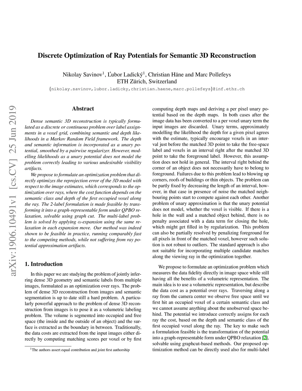 Dense semantic 3D reconstruction is typically formulated as a discrete or continuous problem over label assignments in a voxel grid, combining semantic and depth likelihoods in a Markov Random Field framework. The depth and semantic information is incorporated as a unary potential, smoothed by a pairwise regularizer. However, modelling likelihoods as a unary potential does not model the problem correctly leading to various undesirable visibility artifacts. We propose to formulate an optimization problem that directly optimizes the reprojection error of the 3D model with respect to the image estimates, which corresponds to the optimization over rays, where the cost function depends on the semantic class and depth of the first occupied voxel along the ray. The 2-label formulation is made feasible by transforming it into a graph-representable form under QPBO relaxation, solvable using graph cut. The multi-label problem is solved by applying alpha-expansion using the same relaxation in each expansion move. Our method was indeed shown to be feasible in practice, running comparably fast to the competing methods, while not suffering from ray potential approximation artifacts.