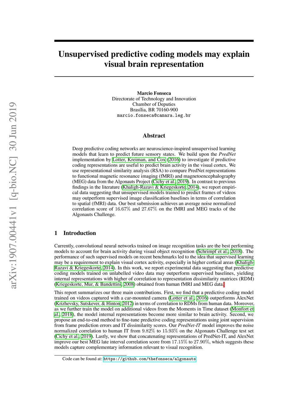 Deep predictive coding networks are neuroscience-inspired unsupervised learning models that learn to predict future sensory states. We build upon the PredNet implementation by Lotter, Kreiman, and Cox (2016) to investigate if predictive coding representations are useful to predict brain activity in the visual cortex. We use representational similarity analysis (RSA) to compare PredNet representations to functional magnetic resonance imaging (fMRI) and magnetoencephalography (MEG) data from the Algonauts Project. In contrast to previous findings in the literature (Khaligh-Razavi &Kriegeskorte, 2014), we report empirical data suggesting that unsupervised models trained to predict frames of videos may outperform supervised image classification baselines. Our best submission achieves an average noise normalized score of 16.67% and 27.67% on the fMRI and MEG tracks of the Algonauts Challenge.