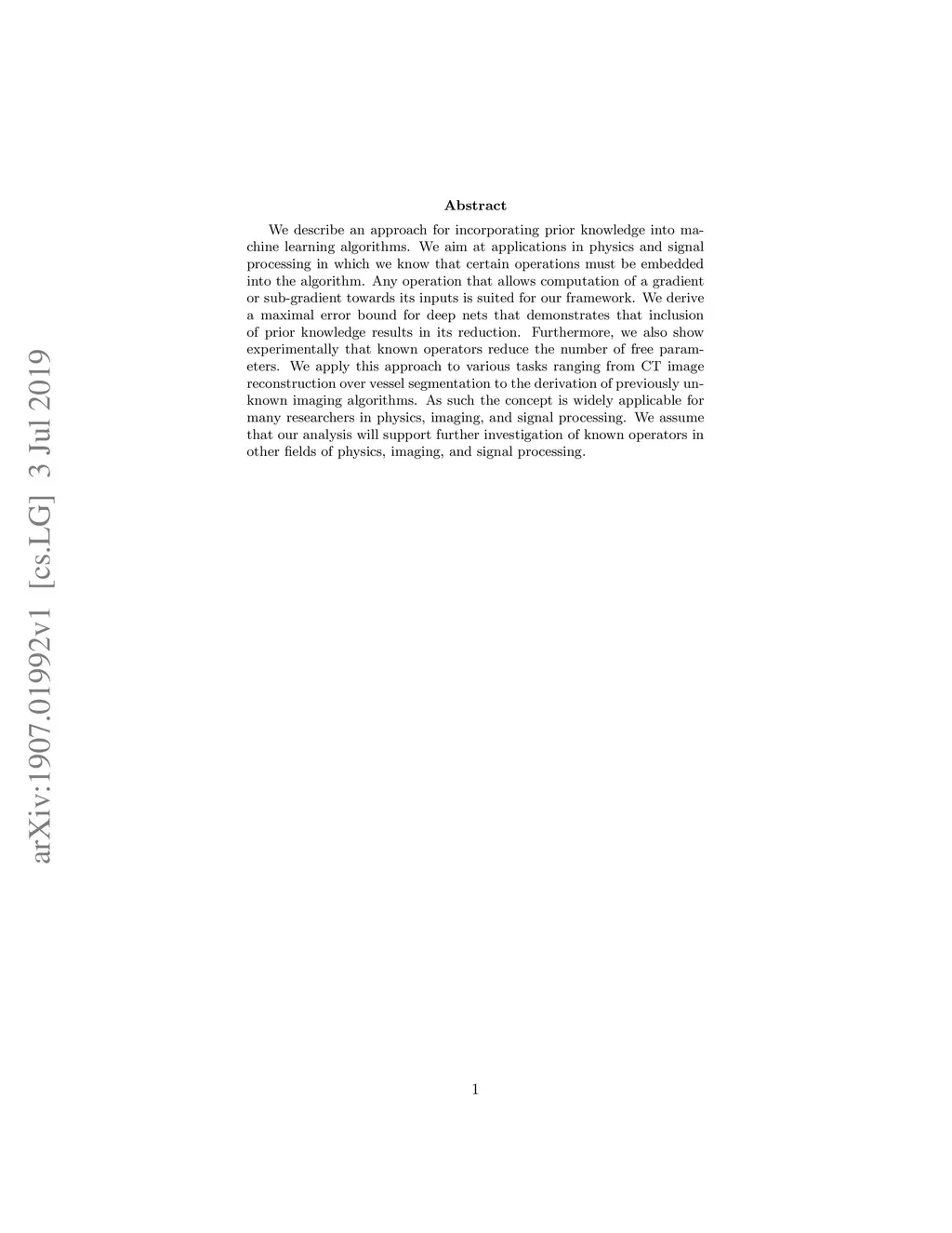 We describe an approach for incorporating prior knowledge into machine learning algorithms. We aim at applications in physics and signal processing in which we know that certain operations must be embedded into the algorithm. Any operation that allows computation of a gradient or sub-gradient towards its inputs is suited for our framework. We derive a maximal error bound for deep nets that demonstrates that inclusion of prior knowledge results in its reduction. Furthermore, we also show experimentally that known operators reduce the number of free parameters. We apply this approach to various tasks ranging from CT image reconstruction over vessel segmentation to the derivation of previously unknown imaging algorithms. As such the concept is widely applicable for many researchers in physics, imaging, and signal processing. We assume that our analysis will support further investigation of known operators in other fields of physics, imaging, and signal processing.