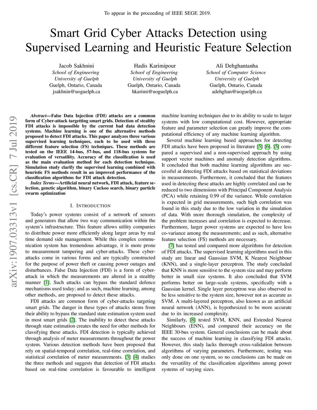 False Data Injection (FDI) attacks are a common form of Cyber-attack targetting smart grids. Detection of stealthy FDI attacks is impossible by the current bad data detection systems. Machine learning is one of the alternative methods proposed to detect FDI attacks. This paper analyzes three various supervised learning techniques, each to be used with three different feature selection (FS) techniques. These methods are tested on the IEEE 14-bus, 57-bus, and 118-bus systems for evaluation of versatility. Accuracy of the classification is used as the main evaluation method for each detection technique. Simulation study clarify the supervised learning combined with heuristic FS methods result in an improved performance of the classification algorithms for FDI attack detection.