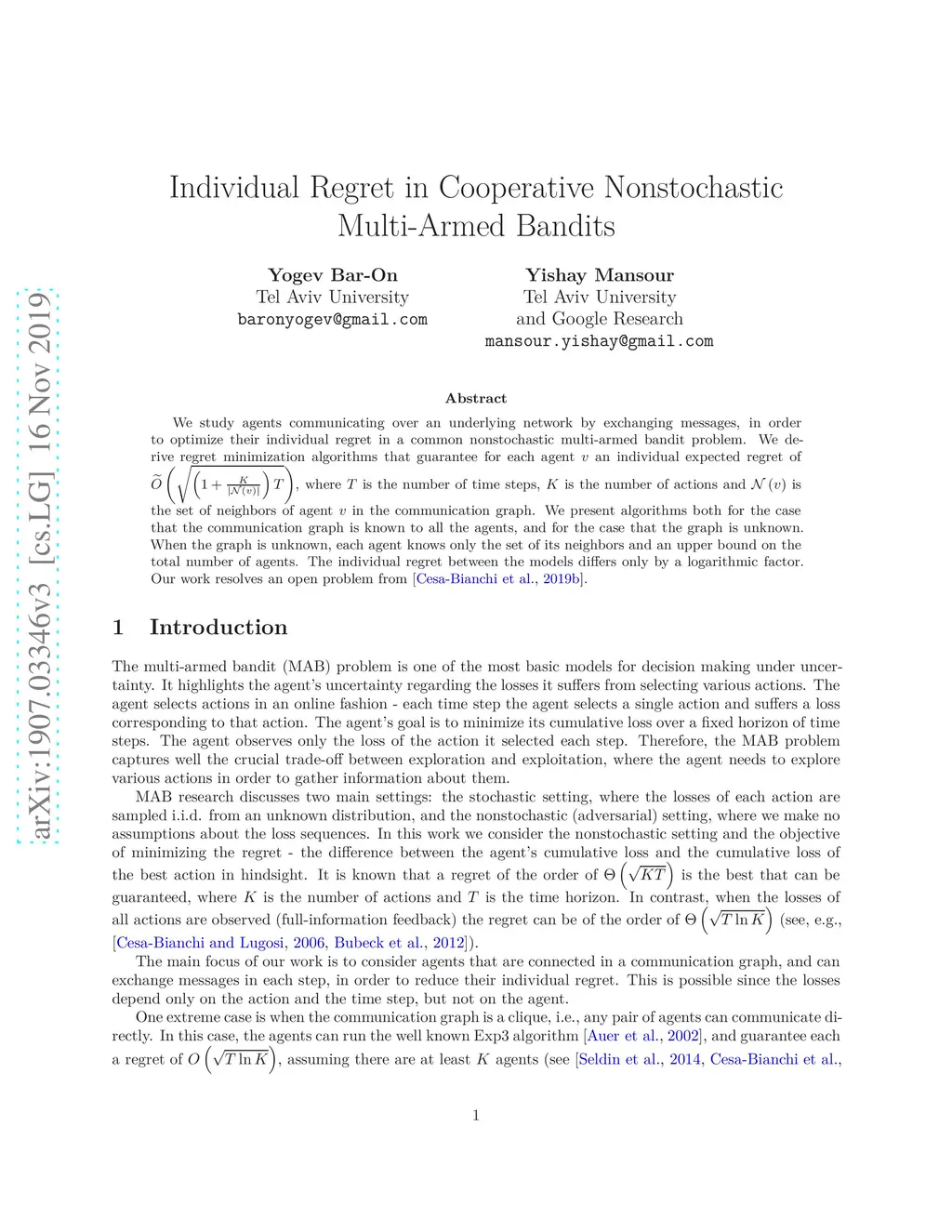 We study agents communicating over an underlying network by exchanging messages, in order to optimize their individual regret in a common nonstochastic multi-armed bandit problem. We derive regret minimization algorithms that guarantee for each agent an individual expected regret of , where is the number of time steps, is the number of actions and is the set of neighbors of agent in the communication graph. We present algorithms both for the case that the communication graph is known to all the agents, and for the case that the graph is unknown. When the graph is unknown, each agent knows only the set of its neighbors and an upper bound on the total number of agents. The individual regret between the models differs only by a logarithmic factor. Our work resolves an open problem from [Cesa-Bianchi et al., 2019b].