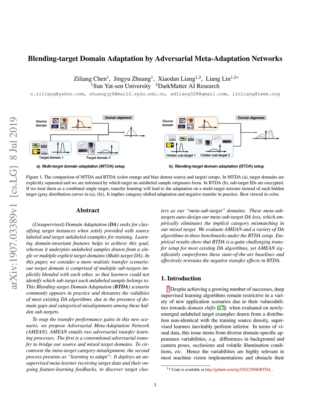 (Unsupervised) Domain Adaptation (DA) seeks for classifying target instances when solely provided with source labeled and target unlabeled examples for training. Learning domain-invariant features helps to achieve this goal, whereas it underpins unlabeled samples drawn from a single or multiple explicit target domains (Multi-target DA). In this paper, we consider a more realistic transfer scenario: our target domain is comprised of multiple sub-targets implicitly blended with each other, so that learners could not identify which sub-target each unlabeled sample belongs to. This Blending-target Domain Adaptation (BTDA) scenario commonly appears in practice and threatens the validities of most existing DA algorithms, due to the presence of domain gaps and categorical misalignments among these hidden sub-targets. To reap the transfer performance gains in this new scenario, we propose Adversarial Meta-Adaptation Network (AMEAN). AMEAN entails two adversarial transfer learning processes. The first is a conventional adversarial transfer to bridge our source and mixed target domains. To circumvent the intra-target category misalignment, the second process presents as ``learning to adapt'': It deploys an unsupervised meta-learner receiving target data and their ongoing feature-learning feedbacks, to discover target clusters as our ``meta-sub-target'' domains. These meta-sub-targets auto-design our meta-sub-target DA loss, which empirically eliminates the implicit category mismatching in our mixed target. We evaluate AMEAN and a variety of DA algorithms in three benchmarks under the BTDA setup. Empirical results show that BTDA is a quite challenging transfer setup for most existing DA algorithms, yet AMEAN significantly outperforms these state-of-the-art baselines and effectively restrains the negative transfer effects in BTDA.
