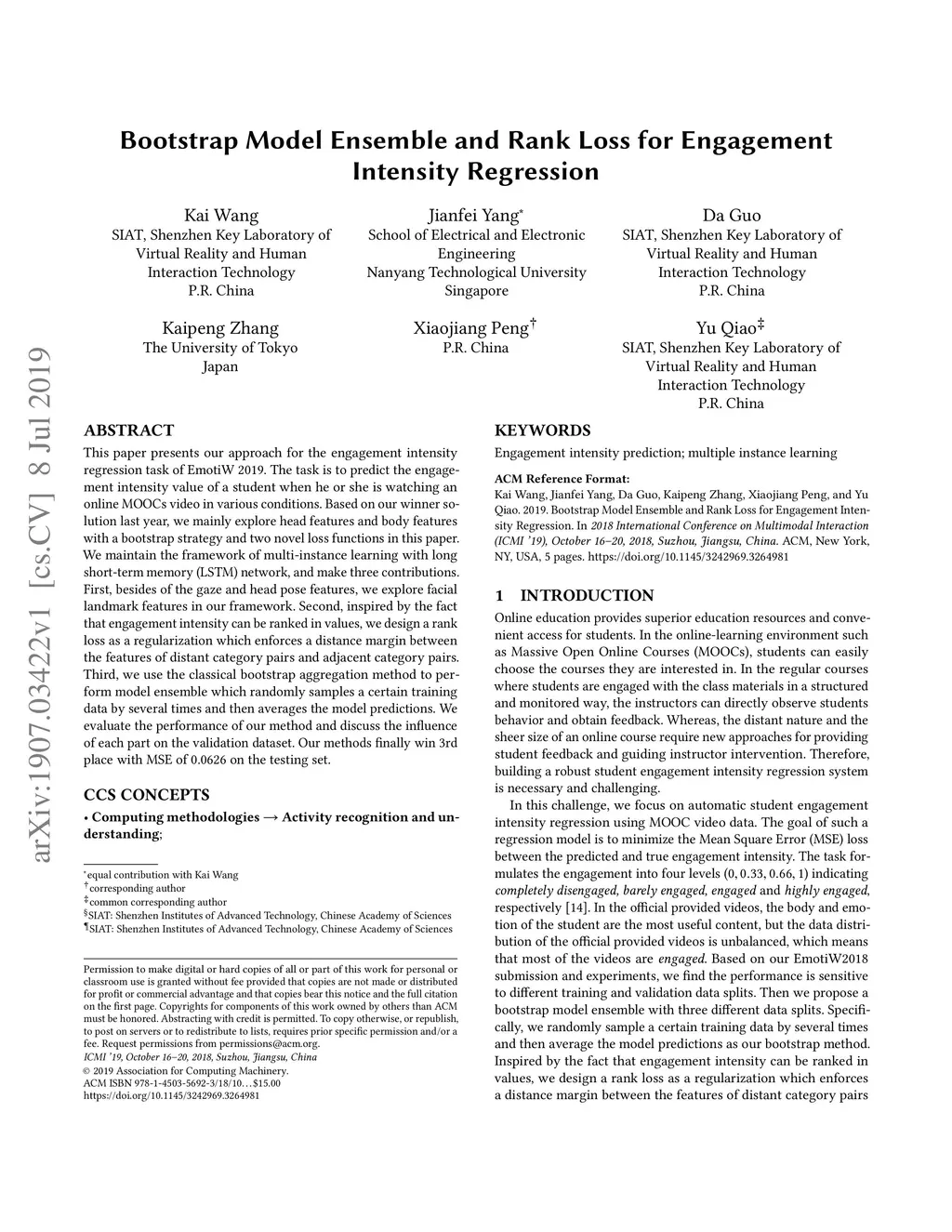 This paper presents our approach for the engagement intensity regression task of EmotiW 2019. The task is to predict the engagement intensity value of a student when he or she is watching an online MOOCs video in various conditions. Based on our winner solution last year, we mainly explore head features and body features with a bootstrap strategy and two novel loss functions in this paper. We maintain the framework of multi-instance learning with long short-term memory (LSTM) network, and make three contributions. First, besides of the gaze and head pose features, we explore facial landmark features in our framework. Second, inspired by the fact that engagement intensity can be ranked in values, we design a rank loss as a regularization which enforces a distance margin between the features of distant category pairs and adjacent category pairs. Third, we use the classical bootstrap aggregation method to perform model ensemble which randomly samples a certain training data by several times and then averages the model predictions. We evaluate the performance of our method and discuss the influence of each part on the validation dataset. Our methods finally win 3rd place with MSE of 0.0626 on the testing set.