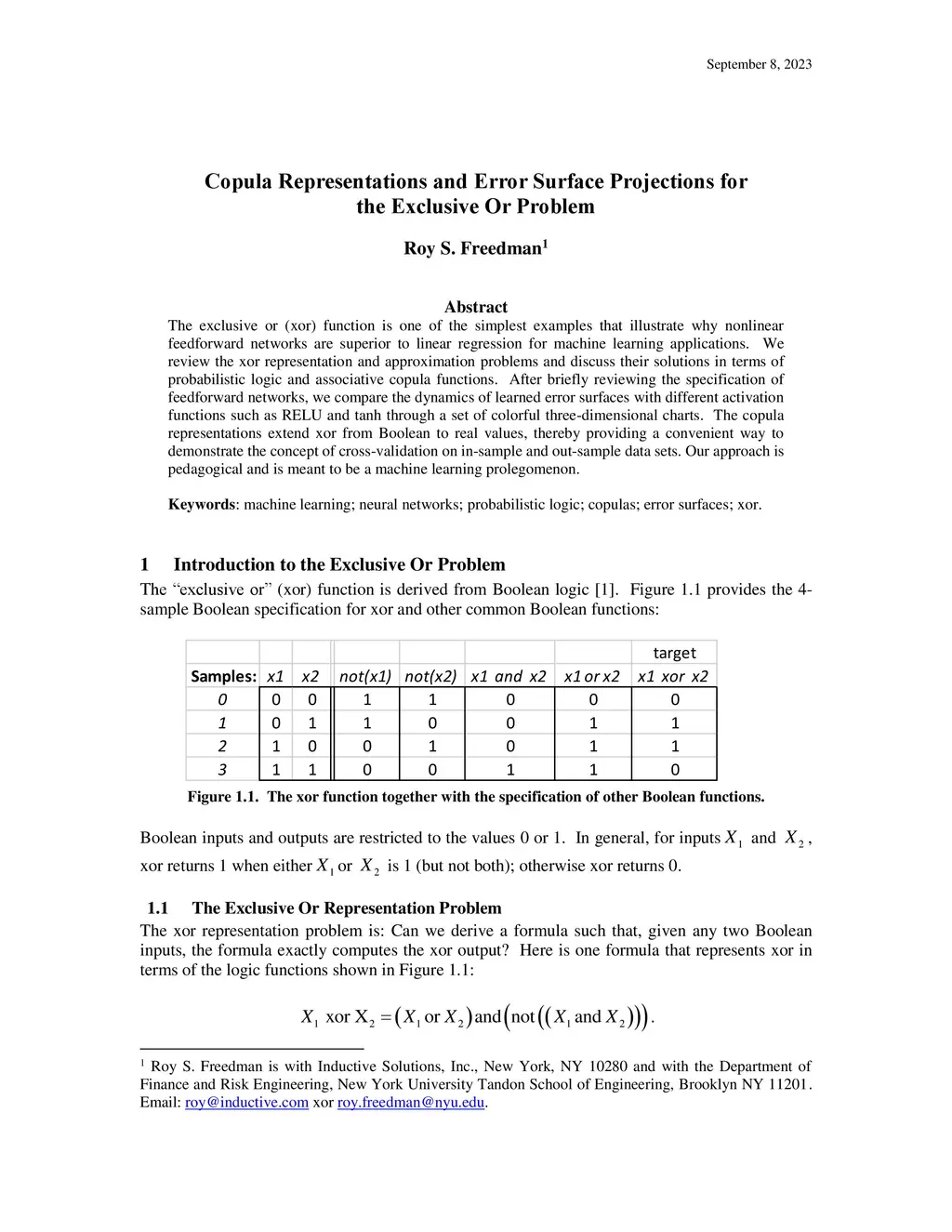The exclusive or (xor) function is one of the simplest examples that illustrate why nonlinear feedforward networks are superior to linear regression for machine learning applications. We review the xor representation and approximation problems and discuss their solutions in terms of probabilistic logic and associative copula functions. After briefly reviewing the specification of feedforward networks, we compare the dynamics of learned error surfaces with different activation functions such as RELU and tanh through a set of colorful three-dimensional charts. The copula representations extend xor from Boolean to real values, thereby providing a convenient way to demonstrate the concept of cross-validation on in-sample and out-sample data sets. Our approach is pedagogical and is meant to be a machine learning prolegomenon.