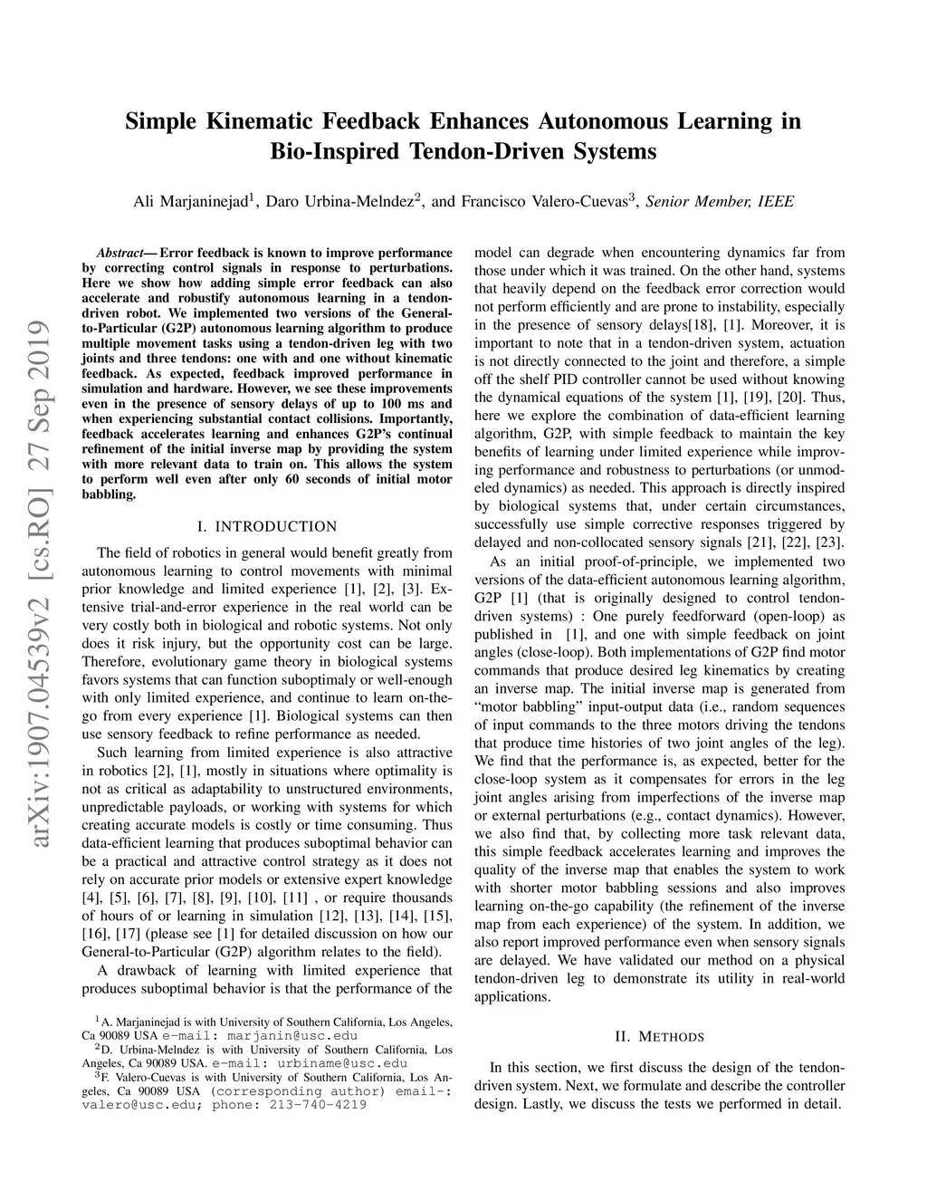 Error feedback is known to improve performance by correcting control signals in response to perturbations. Here we show how adding simple error feedback can also accelerate and robustify autonomous learning in a tendon-driven robot. We implemented two versions of the General-to-Particular (G2P) autonomous learning algorithm to produce multiple movement tasks using a tendon-driven leg with two joints and three tendons: one with and one without kinematic feedback. As expected, feedback improved performance in simulation and hardware. However, we see these improvements even in the presence of sensory delays of up to 100 ms and when experiencing substantial contact collisions. Importantly, feedback accelerates learning and enhances G2P's continual refinement of the initial inverse map by providing the system with more relevant data to train on. This allows the system to perform well even after only 60 seconds of initial motor babbling.
