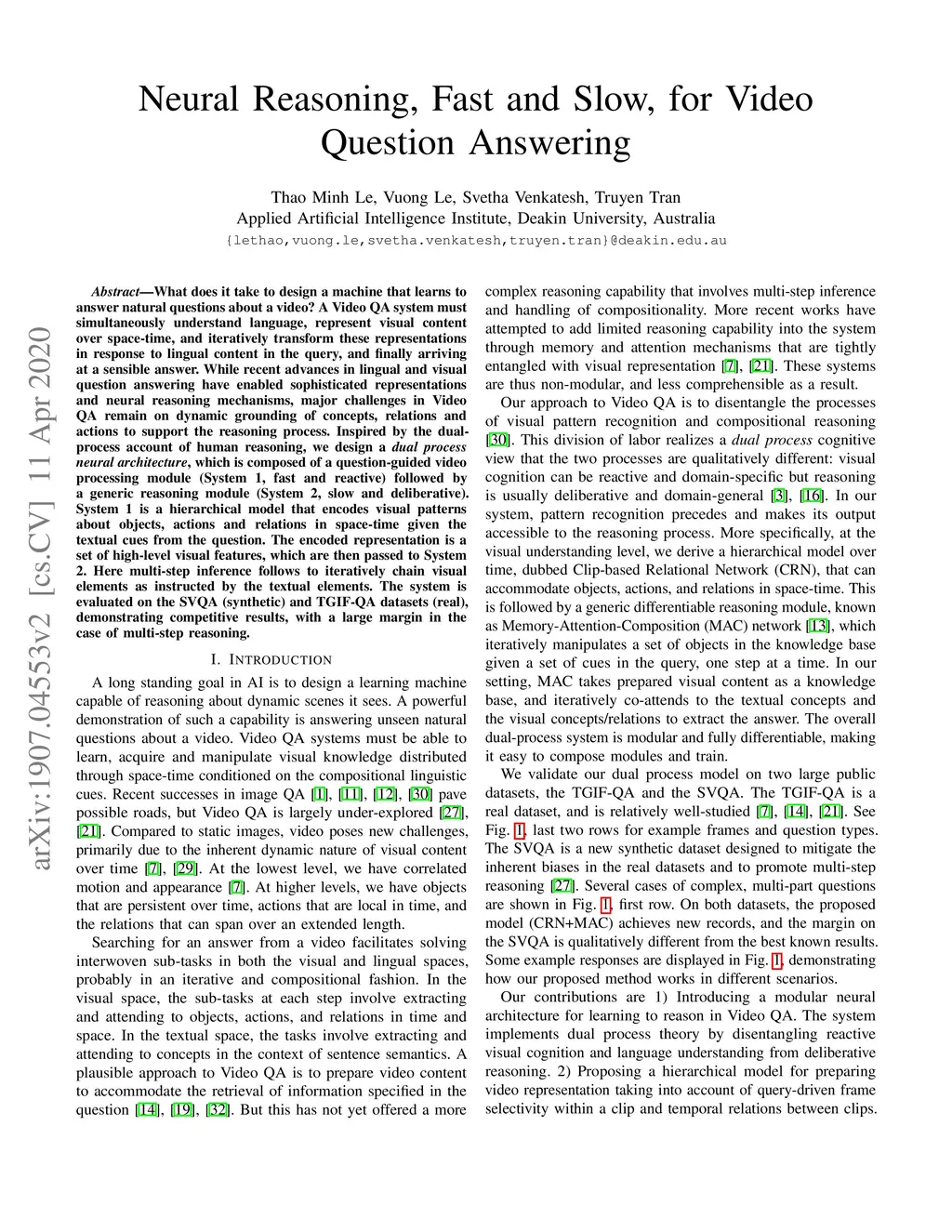 What does it take to design a machine that learns to answer natural questions about a video? A Video QA system must simultaneously understand language, represent visual content over space-time, and iteratively transform these representations in response to lingual content in the query, and finally arriving at a sensible answer. While recent advances in lingual and visual question answering have enabled sophisticated representations and neural reasoning mechanisms, major challenges in Video QA remain on dynamic grounding of concepts, relations and actions to support the reasoning process. Inspired by the dual-process account of human reasoning, we design a dual process neural architecture, which is composed of a question-guided video processing module (System 1, fast and reactive) followed by a generic reasoning module (System 2, slow and deliberative). System 1 is a hierarchical model that encodes visual patterns about objects, actions and relations in space-time given the textual cues from the question. The encoded representation is a set of high-level visual features, which are then passed to System 2. Here multi-step inference follows to iteratively chain visual elements as instructed by the textual elements. The system is evaluated on the SVQA (synthetic) and TGIF-QA datasets (real), demonstrating competitive results, with a large margin in the case of multi-step reasoning.