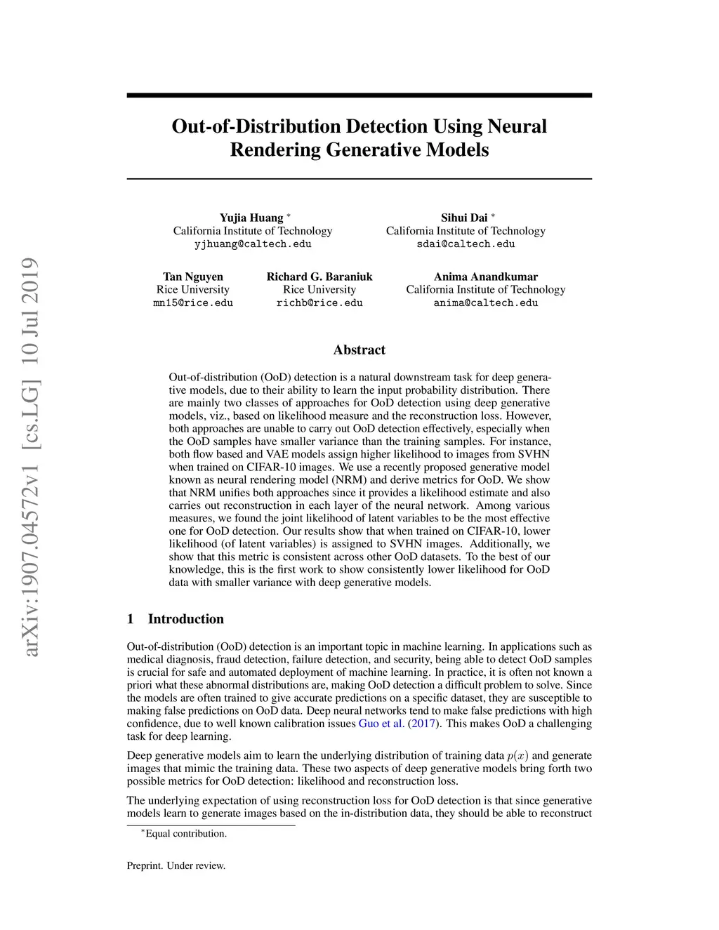 Out-of-distribution (OoD) detection is a natural downstream task for deep generative models, due to their ability to learn the input probability distribution. There are mainly two classes of approaches for OoD detection using deep generative models, viz., based on likelihood measure and the reconstruction loss. However, both approaches are unable to carry out OoD detection effectively, especially when the OoD samples have smaller variance than the training samples. For instance, both flow based and VAE models assign higher likelihood to images from SVHN when trained on CIFAR-10 images. We use a recently proposed generative model known as neural rendering model (NRM) and derive metrics for OoD. We show that NRM unifies both approaches since it provides a likelihood estimate and also carries out reconstruction in each layer of the neural network. Among various measures, we found the joint likelihood of latent variables to be the most effective one for OoD detection. Our results show that when trained on CIFAR-10, lower likelihood (of latent variables) is assigned to SVHN images. Additionally, we show that this metric is consistent across other OoD datasets. To the best of our knowledge, this is the first work to show consistently lower likelihood for OoD data with smaller variance with deep generative models.