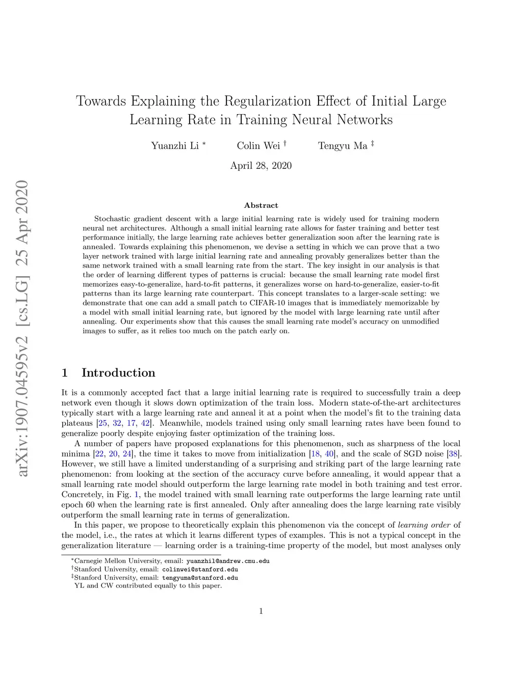 Stochastic gradient descent with a large initial learning rate is widely used for training modern neural net architectures. Although a small initial learning rate allows for faster training and better test performance initially, the large learning rate achieves better generalization soon after the learning rate is annealed. Towards explaining this phenomenon, we devise a setting in which we can prove that a two layer network trained with large initial learning rate and annealing provably generalizes better than the same network trained with a small learning rate from the start. The key insight in our analysis is that the order of learning different types of patterns is crucial: because the small learning rate model first memorizes easy-to-generalize, hard-to-fit patterns, it generalizes worse on hard-to-generalize, easier-to-fit patterns than its large learning rate counterpart. This concept translates to a larger-scale setting: we demonstrate that one can add a small patch to CIFAR-10 images that is immediately memorizable by a model with small initial learning rate, but ignored by the model with large learning rate until after annealing. Our experiments show that this causes the small learning rate model's accuracy on unmodified images to suffer, as it relies too much on the patch early on.