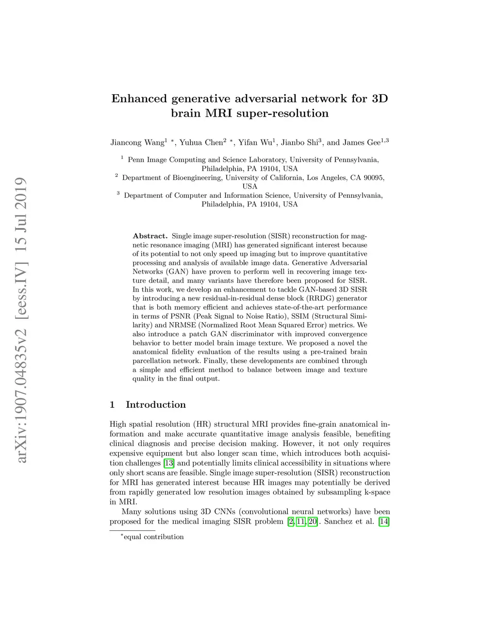 Single image super-resolution (SISR) reconstruction for magnetic resonance imaging (MRI) has generated significant interest because of its potential to not only speed up imaging but to improve quantitative processing and analysis of available image data. Generative Adversarial Networks (GAN) have proven to perform well in recovering image texture detail, and many variants have therefore been proposed for SISR. In this work, we develop an enhancement to tackle GAN-based 3D SISR by introducing a new residual-in-residual dense block (RRDG) generator that is both memory efficient and achieves state-of-the-art performance in terms of PSNR (Peak Signal to Noise Ratio), SSIM (Structural Similarity) and NRMSE (Normalized Root Mean Squared Error) metrics. We also introduce a patch GAN discriminator with improved convergence behavior to better model brain image texture. We proposed a novel the anatomical fidelity evaluation of the results using a pre-trained brain parcellation network. Finally, these developments are combined through a simple and efficient method to balance etween image and texture quality in the final output.