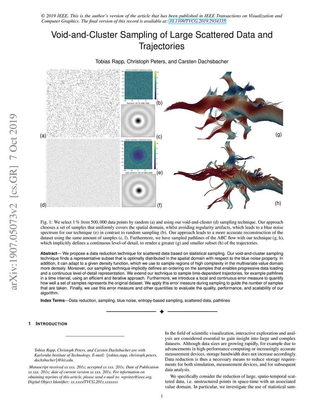 We propose a data reduction technique for scattered data based on statistical sampling. Our void-and-cluster sampling technique finds a representative subset that is optimally distributed in the spatial domain with respect to the blue noise property. In addition, it can adapt to a given density function, which we use to sample regions of high complexity in the multivariate value domain more densely. Moreover, our sampling technique implicitly defines an ordering on the samples that enables progressive data loading and a continuous level-of-detail representation. We extend our technique to sample time-dependent trajectories, for example pathlines in a time interval, using an efficient and iterative approach. Furthermore, we introduce a local and continuous error measure to quantify how well a set of samples represents the original dataset. We apply this error measure during sampling to guide the number of samples that are taken. Finally, we use this error measure and other quantities to evaluate the quality, performance, and scalability of our algorithm.