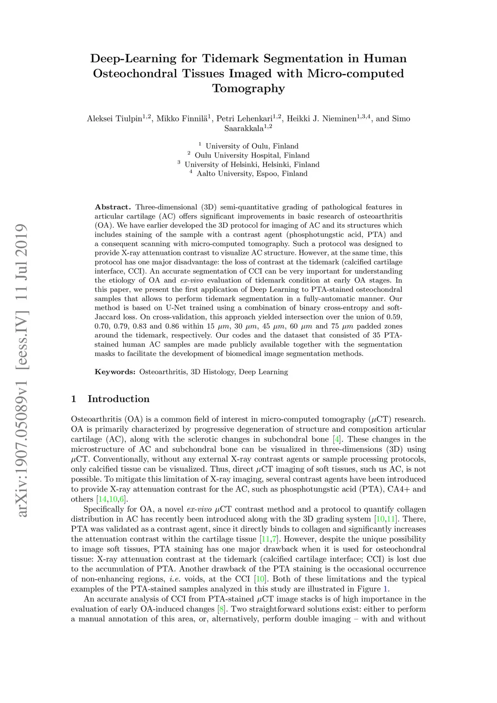 Three-dimensional (3D) semi-quantitative grading of pathological features in articular cartilage (AC) offers significant improvements in basic research of osteoarthritis (OA). We have earlier developed the 3D protocol for imaging of AC and its structures which includes staining of the sample with a contrast agent (phosphotungstic acid, PTA) and a consequent scanning with micro-computed tomography. Such a protocol was designed to provide X-ray attenuation contrast to visualize AC structure. However, at the same time, this protocol has one major disadvantage: the loss of contrast at the tidemark (calcified cartilage interface, CCI). An accurate segmentation of CCI can be very important for understanding the etiology of OA and ex-vivo evaluation of tidemark condition at early OA stages. In this paper, we present the first application of Deep Learning to PTA-stained osteochondral samples that allows to perform tidemark segmentation in a fully-automatic manner. Our method is based on U-Net trained using a combination of binary cross-entropy and soft Jaccard loss. On cross-validation, this approach yielded intersection over the union of 0.59, 0.70, 0.79, 0.83 and 0.86 within 15 {\mu}m, 30 {\mu}m, 45 {\mu}m, 60 {\mu}m and 75 {\mu}m padded zones around the tidemark, respectively. Our codes and the dataset that consisted of 35 PTA-stained human AC samples are made publicly available together with the segmentation masks to facilitate the development of biomedical image segmentation methods.