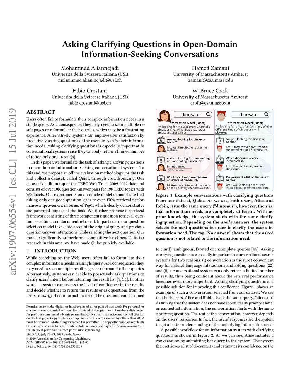 Users often fail to formulate their complex information needs in a single query. As a consequence, they may need to scan multiple result pages or reformulate their queries, which may be a frustrating experience. Alternatively, systems can improve user satisfaction by proactively asking questions of the users to clarify their information needs. Asking clarifying questions is especially important in conversational systems since they can only return a limited number of (often only one) result(s). In this paper, we formulate the task of asking clarifying questions in open-domain information-seeking conversational systems. To this end, we propose an offline evaluation methodology for the task and collect a dataset, called Qulac, through crowdsourcing. Our dataset is built on top of the TREC Web Track 2009-2012 data and consists of over 10K question-answer pairs for 198 TREC topics with 762 facets. Our experiments on an oracle model demonstrate that asking only one good question leads to over 170% retrieval performance improvement in terms of P@1, which clearly demonstrates the potential impact of the task. We further propose a retrieval framework consisting of three components: question retrieval, question selection, and document retrieval. In particular, our question selection model takes into account the original query and previous question-answer interactions while selecting the next question. Our model significantly outperforms competitive baselines. To foster research in this area, we have made Qulac publicly available.