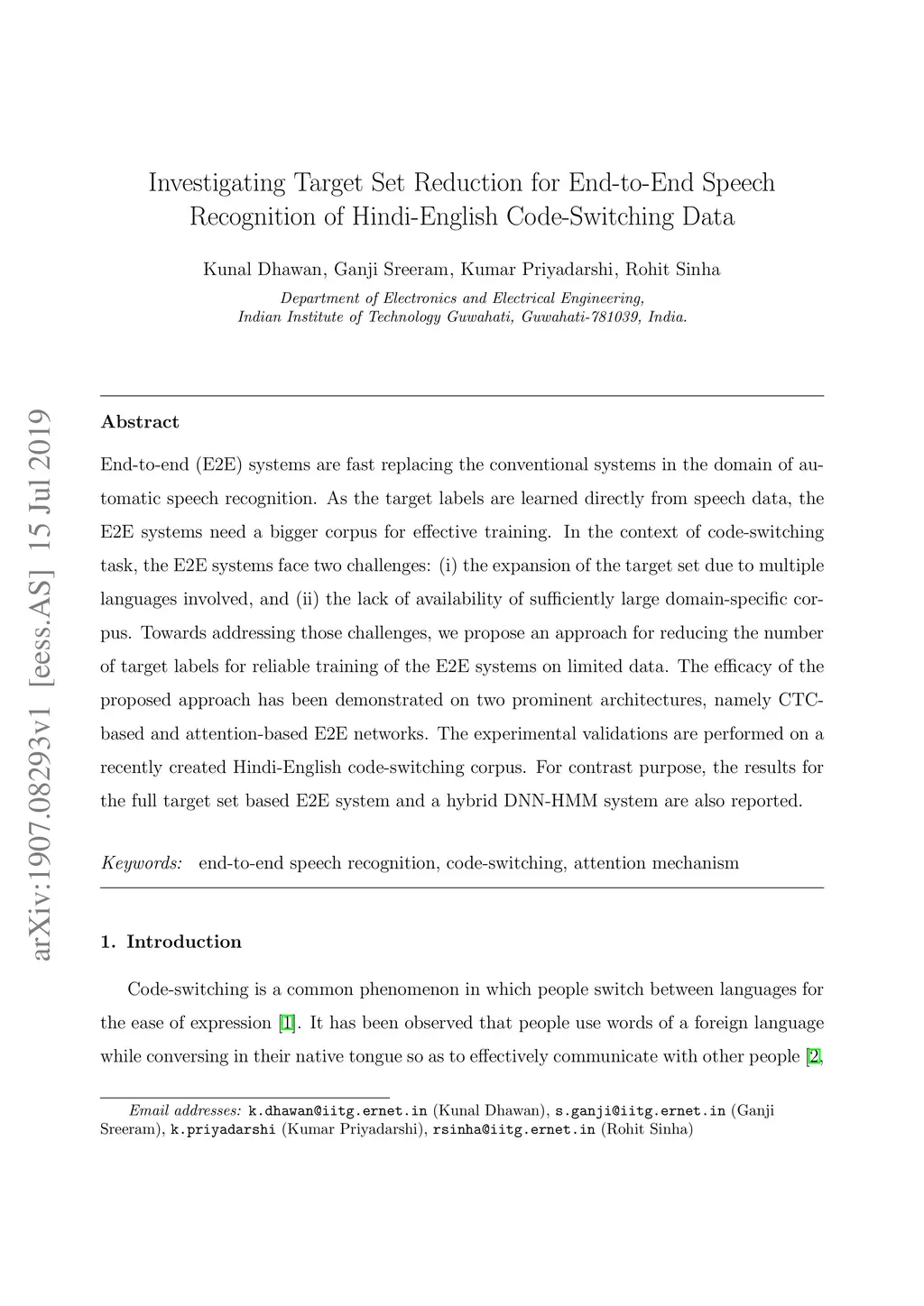End-to-end (E2E) systems are fast replacing the conventional systems in the domain of automatic speech recognition. As the target labels are learned directly from speech data, the E2E systems need a bigger corpus for effective training. In the context of code-switching task, the E2E systems face two challenges: (i) the expansion of the target set due to multiple languages involved, and (ii) the lack of availability of sufficiently large domain-specific corpus. Towards addressing those challenges, we propose an approach for reducing the number of target labels for reliable training of the E2E systems on limited data. The efficacy of the proposed approach has been demonstrated on two prominent architectures, namely CTC-based and attention-based E2E networks. The experimental validations are performed on a recently created Hindi-English code-switching corpus. For contrast purpose, the results for the full target set based E2E system and a hybrid DNN-HMM system are also reported.