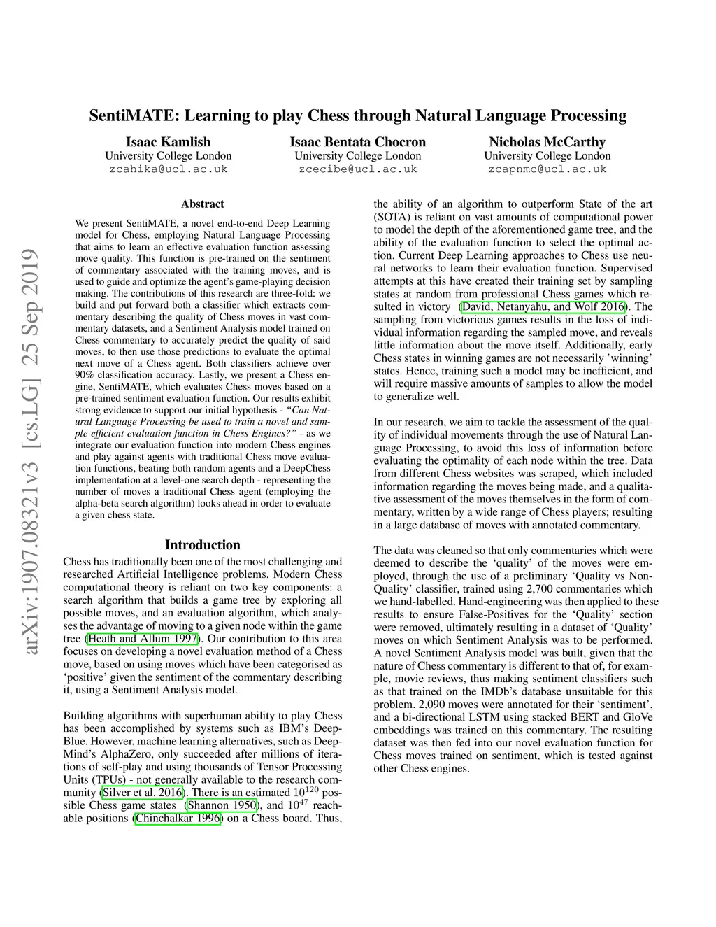 SentiMATE: Learning to play Chess through Natural Language Processing