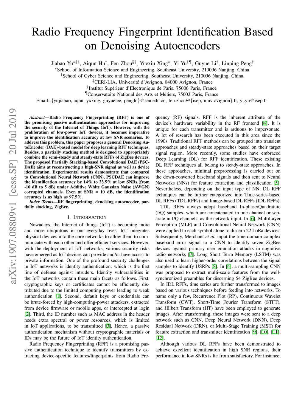 Radio Frequency Fingerprinting (RFF) is one of the promising passive authentication approaches for improving the security of the Internet of Things (IoT). However, with the proliferation of low-power IoT devices, it becomes imperative to improve the identification accuracy at low SNR scenarios. To address this problem, this paper proposes a general Denoising AutoEncoder (DAE)-based model for deep learning RFF techniques. Besides, a partially stacking method is designed to appropriately combine the semi-steady and steady-state RFFs of ZigBee devices. The proposed Partially Stacking-based Convolutional DAE (PSC-DAE) aims at reconstructing a high-SNR signal as well as device identification. Experimental results demonstrate that compared to Convolutional Neural Network (CNN), PSCDAE can improve the identification accuracy by 14% to 23.5% at low SNRs (from -10 dB to 5 dB) under Additive White Gaussian Noise (AWGN) corrupted channels. Even at SNR = 10 dB, the identification accuracy is as high as 97.5%.