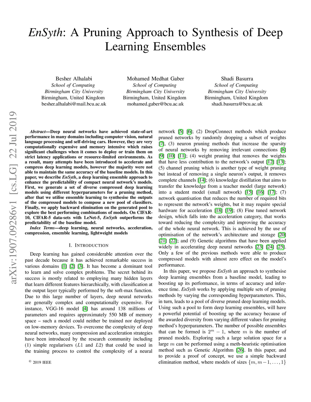 Deep neural networks have achieved state-of-art performance in many domains including computer vision, natural language processing and self-driving cars. However, they are very computationally expensive and memory intensive which raises significant challenges when it comes to deploy or train them on strict latency applications or resource-limited environments. As a result, many attempts have been introduced to accelerate and compress deep learning models, however the majority were not able to maintain the same accuracy of the baseline models. In this paper, we describe EnSyth, a deep learning ensemble approach to enhance the predictability of compact neural network's models. First, we generate a set of diverse compressed deep learning models using different hyperparameters for a pruning method, after that we utilise ensemble learning to synthesise the outputs of the compressed models to compose a new pool of classifiers. Finally, we apply backward elimination on the generated pool to explore the best performing combinations of models. On CIFAR-10, CIFAR-5 data-sets with LeNet-5, EnSyth outperforms the predictability of the baseline model.