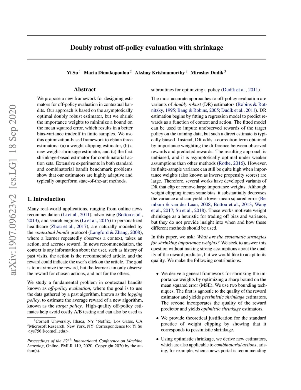 We propose a new framework for designing estimators for off-policy evaluation in contextual bandits. Our approach is based on the asymptotically optimal doubly robust estimator, but we shrink the importance weights to minimize a bound on the mean squared error, which results in a better bias-variance tradeoff in finite samples. We use this optimization-based framework to obtain three estimators: (a) a weight-clipping estimator, (b) a new weight-shrinkage estimator, and (c) the first shrinkage-based estimator for combinatorial action sets. Extensive experiments in both standard and combinatorial bandit benchmark problems show that our estimators are highly adaptive and typically outperform state-of-the-art methods.