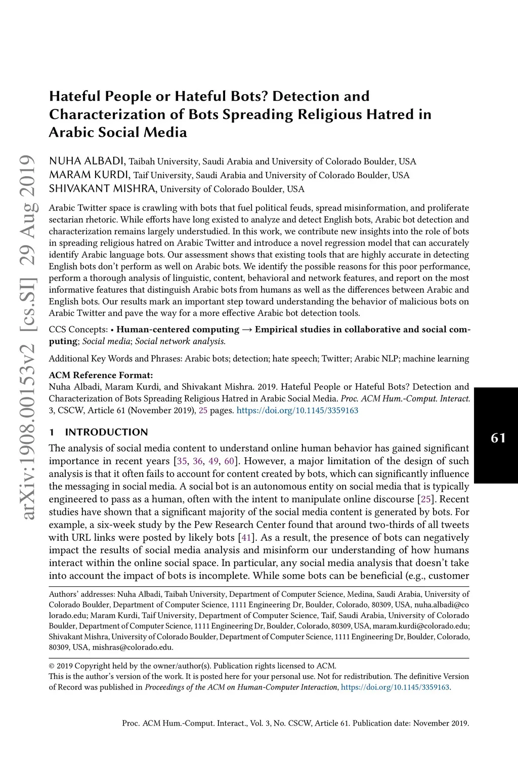 Arabic Twitter space is crawling with bots that fuel political feuds, spread misinformation, and proliferate sectarian rhetoric. While efforts have long existed to analyze and detect English bots, Arabic bot detection and characterization remains largely understudied. In this work, we contribute new insights into the role of bots in spreading religious hatred on Arabic Twitter and introduce a novel regression model that can accurately identify Arabic language bots. Our assessment shows that existing tools that are highly accurate in detecting English bots don't perform as well on Arabic bots. We identify the possible reasons for this poor performance, perform a thorough analysis of linguistic, content, behavioral and network features, and report on the most informative features that distinguish Arabic bots from humans as well as the differences between Arabic and English bots. Our results mark an important step toward understanding the behavior of malicious bots on Arabic Twitter and pave the way for a more effective Arabic bot detection tools.