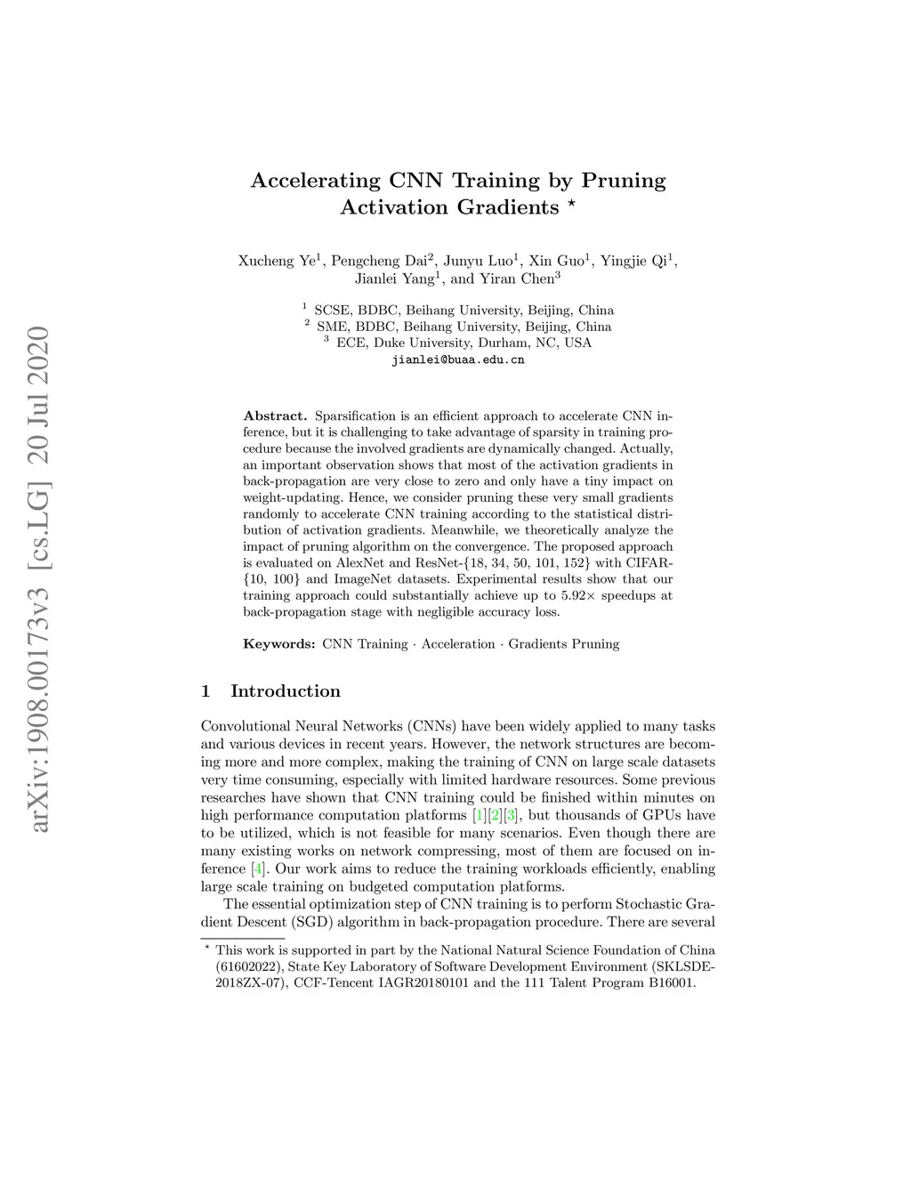 Sparsification is an efficient approach to accelerate CNN inference, but it is challenging to take advantage of sparsity in training procedure because the involved gradients are dynamically changed. Actually, an important observation shows that most of the activation gradients in back-propagation are very close to zero and only have a tiny impact on weight-updating. Hence, we consider pruning these very small gradients randomly to accelerate CNN training according to the statistical distribution of activation gradients. Meanwhile, we theoretically analyze the impact of pruning algorithm on the convergence. The proposed approach is evaluated on AlexNet and ResNet-\{18, 34, 50, 101, 152\} with CIFAR-\{10, 100\} and ImageNet datasets. Experimental results show that our training approach could substantially achieve up to speedups at back-propagation stage with negligible accuracy loss.