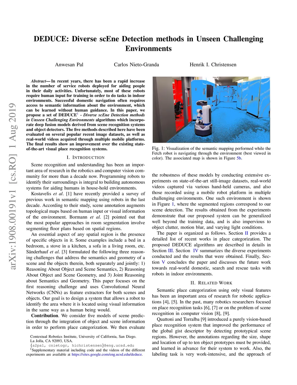 In recent years, there has been a rapid increase in the number of service robots deployed for aiding people in their daily activities. Unfortunately, most of these robots require human input for training in order to do tasks in indoor environments. Successful domestic navigation often requires access to semantic information about the environment, which can be learned without human guidance. In this paper, we propose a set of DEDUCE - Diverse scEne Detection methods in Unseen Challenging Environments algorithms which incorporate deep fusion models derived from scene recognition systems and object detectors. The five methods described here have been evaluated on several popular recent image datasets, as well as real-world videos acquired through multiple mobile platforms. The final results show an improvement over the existing state-of-the-art visual place recognition systems.