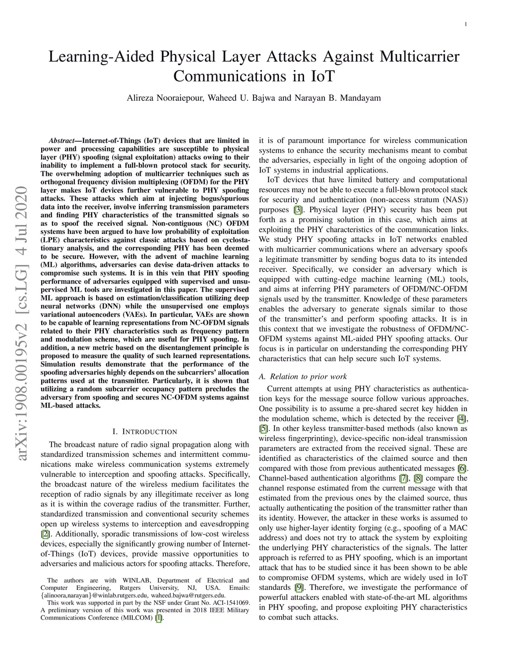 Internet-of-Things (IoT) devices that are limited in power and processing are susceptible to physical layer (PHY) spoofing (signal exploitation) attacks owing to their inability to implement a full-blown protocol stack for security. The overwhelming adoption of multicarrier techniques such as orthogonal frequency division multiplexing (OFDM) for the PHY layer makes IoT devices further vulnerable to PHY spoofing attacks. These attacks which aim at injecting bogus/spurious data into the receiver, involve inferring transmission parameters and finding PHY characteristics of the transmitted signals so as to spoof the received signal. Non-contiguous (NC) OFDM systems have been argued to have low probability of exploitation (LPE) characteristics against classic attacks based on cyclostationary analysis, and the corresponding PHY has been deemed to be secure. However, with the advent of machine learning (ML) algorithms, adversaries can devise data-driven attacks to compromise such systems. It is in this vein that PHY spoofing performance of adversaries equipped with supervised and unsupervised ML tools are investigated in this paper. The supervised ML approach is based on deep neural networks (DNN) while the unsupervised one employs variational autoencoders (VAEs). In particular, VAEs are shown to be capable of learning representations from NC-OFDM signals related to their PHY characteristics such as frequency pattern and modulation scheme, which are useful for PHY spoofing. In addition, a new metric based on the disentanglement principle is proposed to measure the quality of such learned representations. Simulation results demonstrate that the performance of the spoofing adversaries highly depends on the subcarriers' allocation patterns. Particularly, it is shown that utilizing a random subcarrier occupancy pattern secures NC-OFDM systems against ML-based attacks.