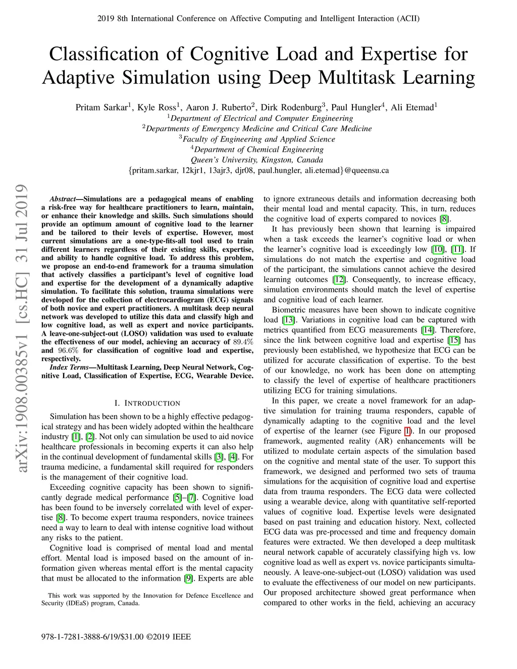 Simulations are a pedagogical means of enabling a risk-free way for healthcare practitioners to learn, maintain, or enhance their knowledge and skills. Such simulations should provide an optimum amount of cognitive load to the learner and be tailored to their levels of expertise. However, most current simulations are a one-type-fits-all tool used to train different learners regardless of their existing skills, expertise, and ability to handle cognitive load. To address this problem, we propose an end-to-end framework for a trauma simulation that actively classifies a participant's level of cognitive load and expertise for the development of a dynamically adaptive simulation. To facilitate this solution, trauma simulations were developed for the collection of electrocardiogram (ECG) signals of both novice and expert practitioners. A multitask deep neural network was developed to utilize this data and classify high and low cognitive load, as well as expert and novice participants. A leave-one-subject-out (LOSO) validation was used to evaluate the effectiveness of our model, achieving an accuracy of 89.4% and 96.6% for classification of cognitive load and expertise, respectively.