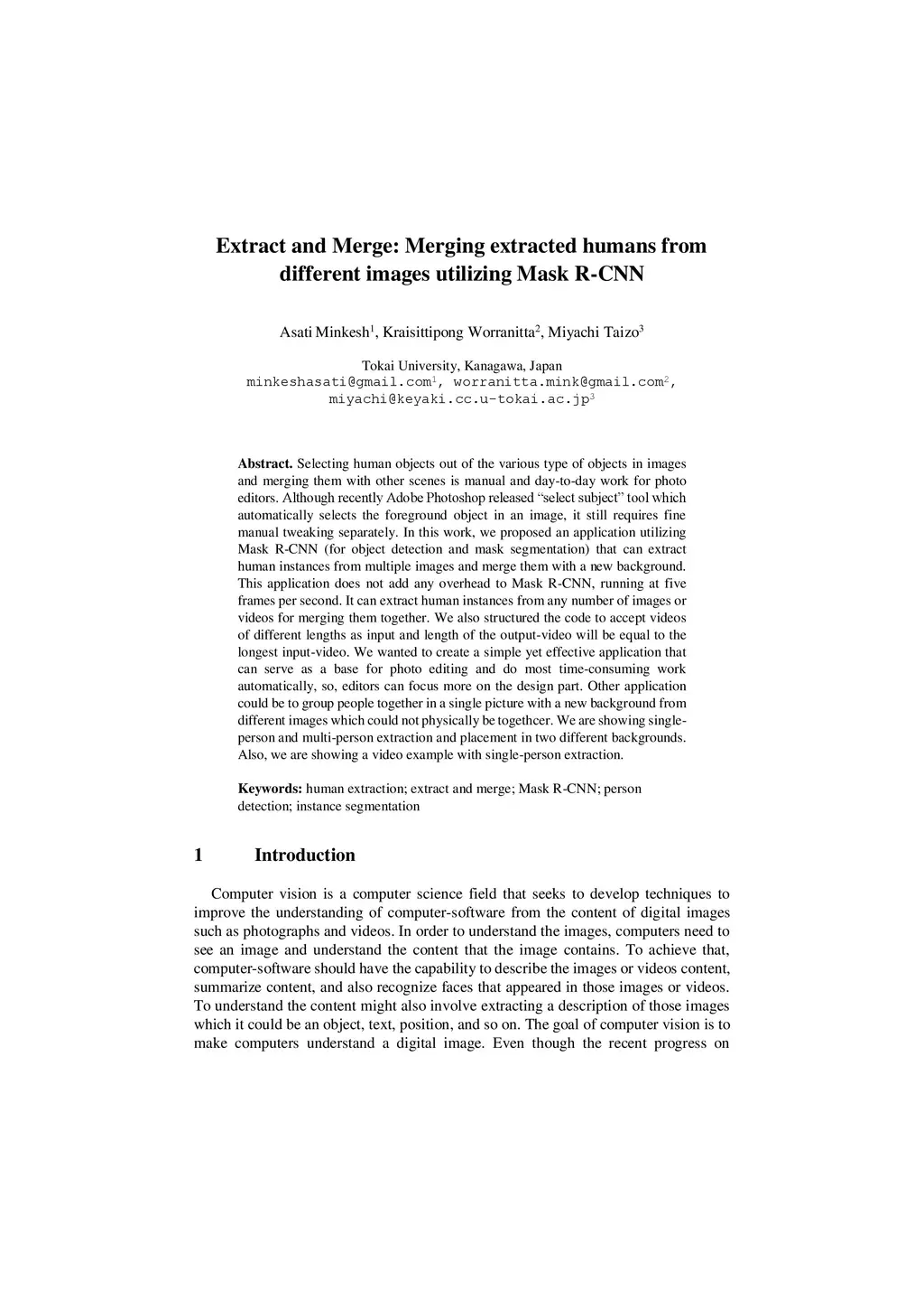 Selecting human objects out of the various type of objects in images and merging them with other scenes is manual and day-to-day work for photo editors. Although recently Adobe photoshop released "select subject" tool which automatically selects the foreground object in an image, but still requires fine manual tweaking separately. In this work, we proposed an application utilizing Mask R-CNN (for object detection and mask segmentation) that can extract human instances from multiple images and merge them with a new background. This application does not add any overhead to Mask R-CNN, running at 5 frames per second. It can extract human instances from any number of images or videos from merging them together. We also structured the code to accept videos of different lengths as input and length of the output-video will be equal to the longest input-video. We wanted to create a simple yet effective application that can serve as a base for photo editing and do most time-consuming work automatically, so, editors can focus more on the design part. Other application could be to group people together in a single picture with a new background from different images which could not be physically together. We are showing single-person and multi-person extraction and placement in two different backgrounds. Also, we are showing a video example with single-person extraction.